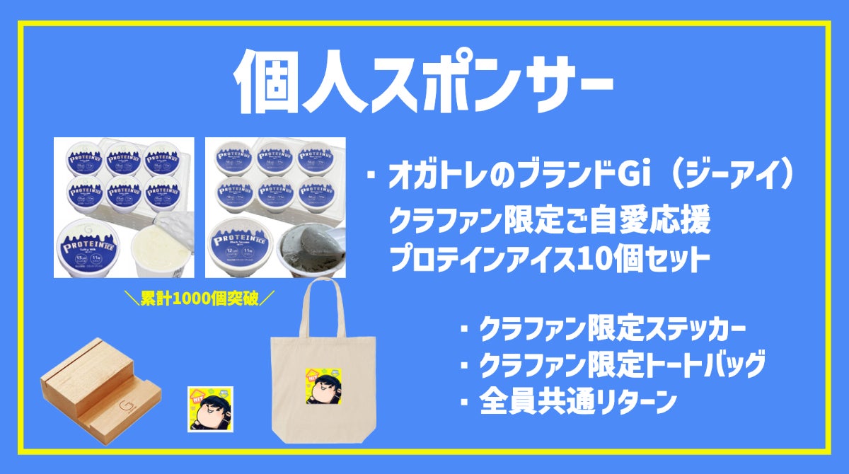 ●1.2万円リターン例:オガトレ発のブランドGi(ジーアイ)のプロテインアイス(10個)、スタンドに加え、限定トートバッグ、限定ステッカーのセットです。*原材料及び添加物等の食品表示はお届け商品のラベルに表記されます(沖縄・離島のアイス発送はできません。もし沖縄・離島の方のお申し込みの場合はプロテインバー14本入に変更させていただきます。)