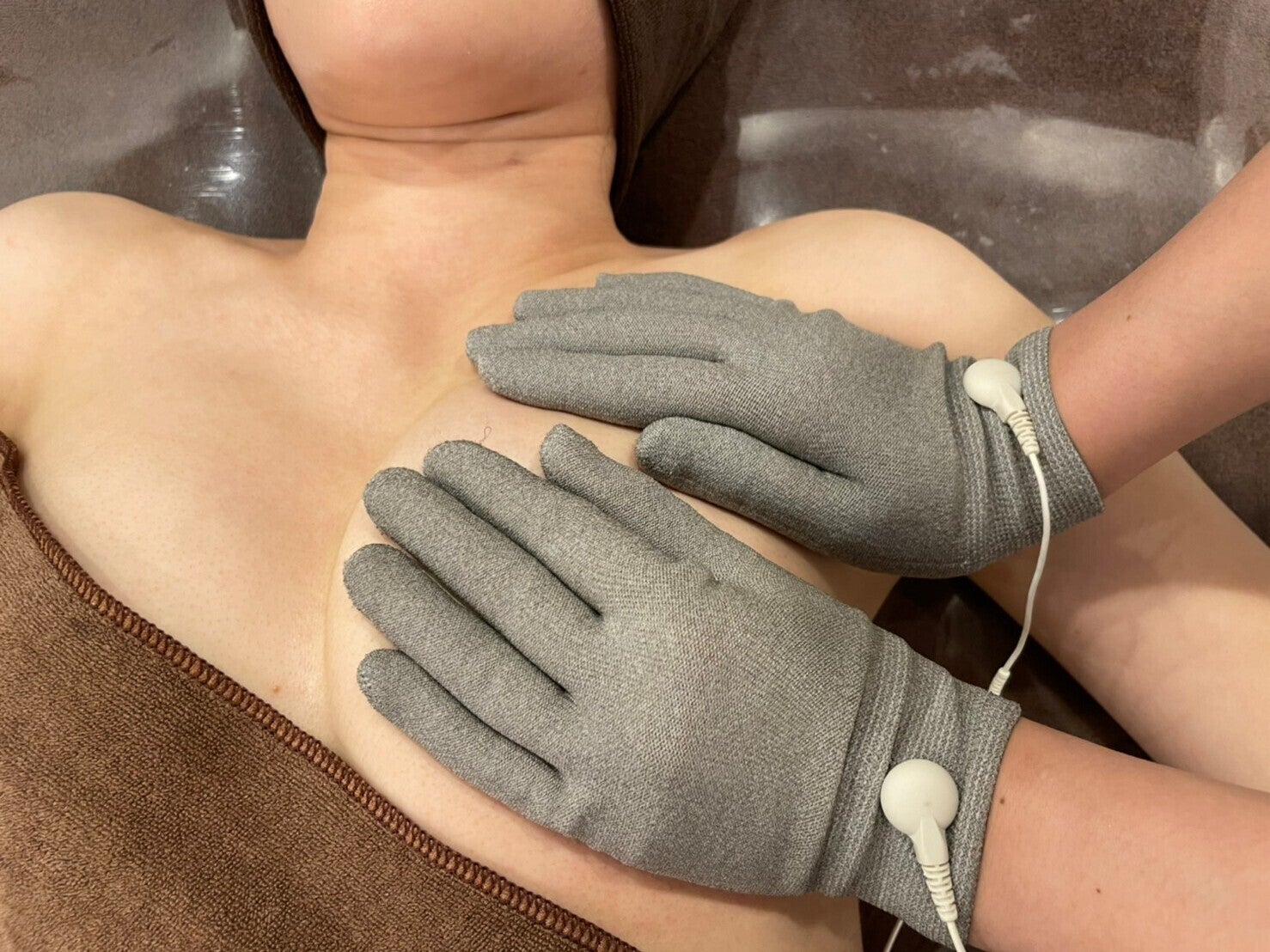• 次にMFRという特殊な電気が流れるグローブを使って、首回り、肩回り、鎖骨、肩甲骨、ワキ、手などののコリやハリをほぐします。筋肉の周りには、筋膜と呼ばれる膜が存在しますが、筋肉と筋膜が癒着しているとコリやハリの原因になります。その癒着をはがしていきます(筋膜リリース)。またMFRは同時にインナーマッスルを強化することができますので、良い状態での持続期間をアップさせることが可能です。コリやハリがあると、正しい姿勢が保てなくなり、正しいバストの位置を維持することが難しくなります。また、コリやハリが原因で背中やワキに流れてしまっているバストにあるべき脂肪をバストに戻しやすくすることができます。デスクワークやスマホの利用で姿勢が崩れてしまっている方も多いです。首、肩回りの状態を確認させていただき、必要に応じて、ほぐす施術を実施し、正しい姿勢と正しいバストの位置が維持できるように施術させていただきます。