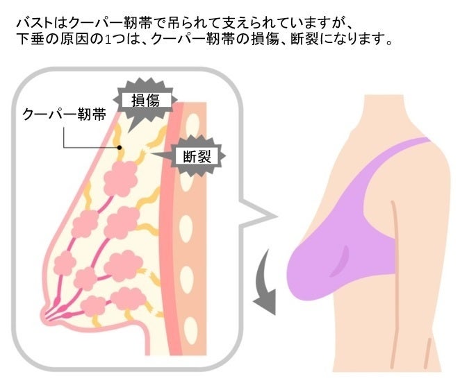 2つ目にも記載しましたが、バストは乳腺1割と脂肪9割で形成されています 。この乳腺に刺激を与えてあげると、乳腺を守るために脂肪が乳腺の周りに集まります。乳腺を刺激するためにご自身で胸をマッサージをすれば、脂肪が集まり、バストアップにつながります。またバストの皮下組織には、クーパー靭帯があります。クーパー靭帯とは、肋骨・大胸筋・乳房・皮膚をつなげて支えている結合組織で、コラーゲンが主成分で、脇に乳腺や脂肪が流れないようにする役割を持っています。この靭帯は、少し伸びただけなら修復も可能な場合もありますが、一度切れてしまった場合は、もう戻りません。ですので、普段の生活では自分にあった下着を着けることはとても大事ですし、運動時には、しっかりバストをサポートしてくれるスポーツブラは必ずつけて、クーパー靭帯を保護してほしいです。