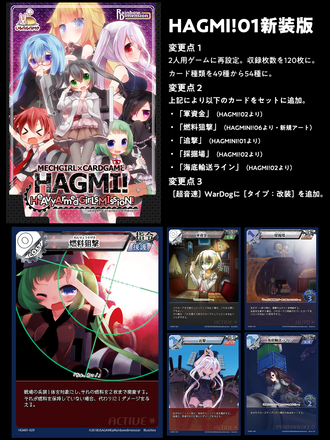 こんにちは、USAGAME@Rainbowdimensionのひろです! 今回は新作「HAGMI!03 THE FULLMETAL DUELIST」のご紹介です! 03の概要 HAGMI!03では、今までの「共通のデッキを使って戦う」ルールではなく、各々がデッキを作って持ち寄る「構築戦」を主軸においたものになります。 その為、収録されるカードは「2種類の構築済みデッキ」という形になります。 各デッキは「陸+空」と「海+宇宙」に分かれ、それぞれ、収録カード同士のシナジーを考えた構築になっております。 この「[宇宙戦艦]Fluegel」は「海+宇宙」デッキのメインカードです。 ちなみに「陸+空」デッキのメインカードはからます様が担当されます。 新要素「秘策」 そして、本作からの新要素として「秘策」というものが追加されます。 以下のカードをご覧ください。 秘策は、メインで構築するデッキとはまた別に選ぶことができるカードで、各プレーヤーは「作戦・兵器デッキの総数20枚に付き1枚」を秘策として持つことができます。 上記の「[宇宙戦艦]Fluegel_Ⅱ」は白い枠の「秘策専用カード」ですが、秘策として持てるカードには特に制限はありません。通常の兵器カードや作戦カードなども秘策に選択できます。 ただしいつでもアクセスできるというわけではなく、「秘策を参照するスキル」等でのみアクセスできる領域になります。 そして、お察しの通り「HAGMI!03」のもうひとつのテーマは「改装」です。 今までは特に意味のなかった[タイプ:改装]ですが、03以降ではその意味が大きく変わっていくことでしょう。 改装について、詳しくは以下を御覧ください。 03に収録される各デッキは60枚構成のため、秘策用のカードが3枚ずつ収録されており、 「陸+空デッキ」では、また違ったギミックの「改装」が楽しめる作りになっております。 「秘策」「改装」はカードプールの量によって意味のあるモノになりますので、今後の開発につれてさらに奥深いギミックになる予定です。 これからのHAGMI!の可能性を更に広げるために、是非本プロジェクトを、延いてはUSAGAMEへの応援をお願いします! それでは、HAGMI!03、および本プロジェクトをよろしくお願いいたします! USAGAME@Rainbowdimension ひろ
