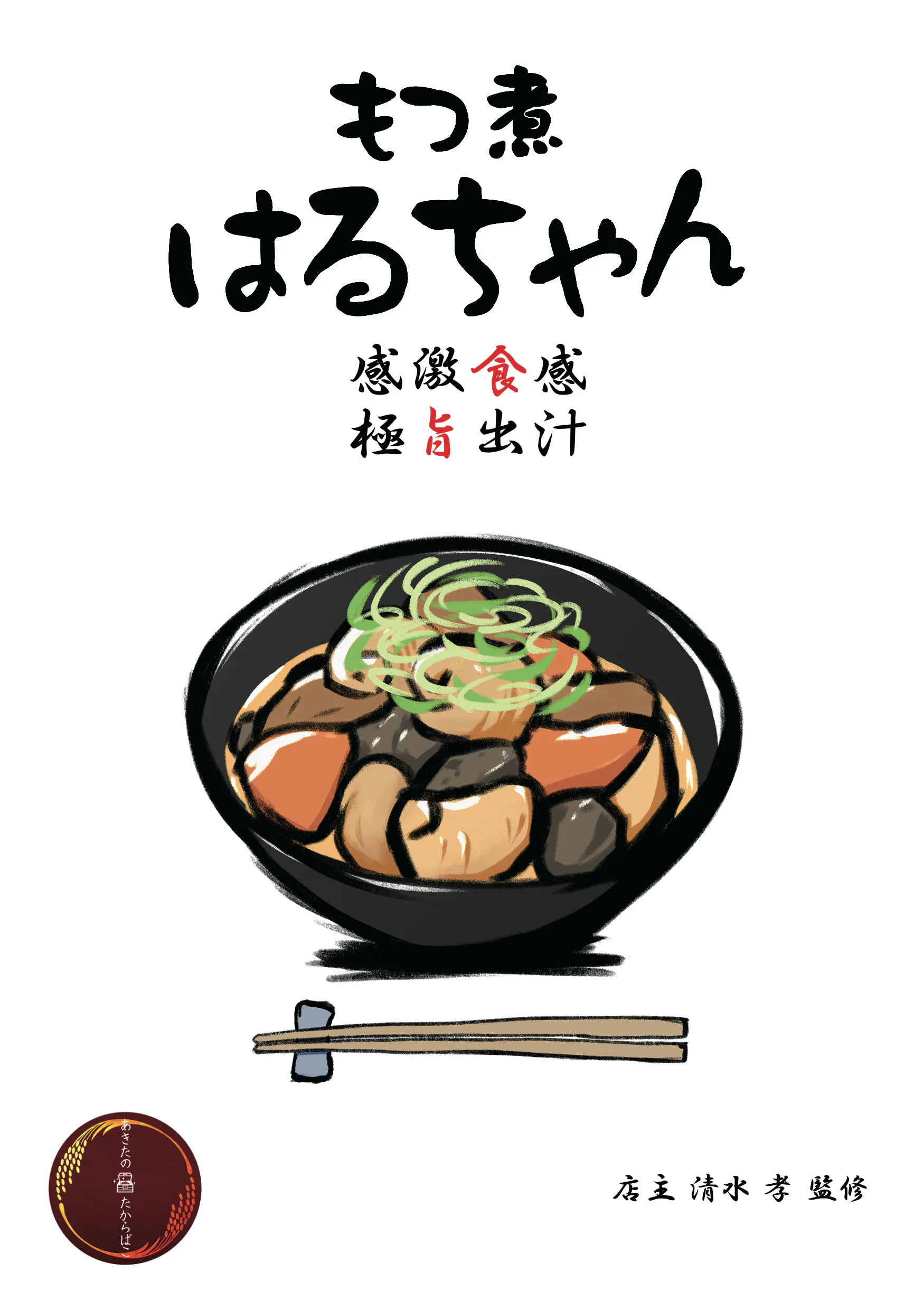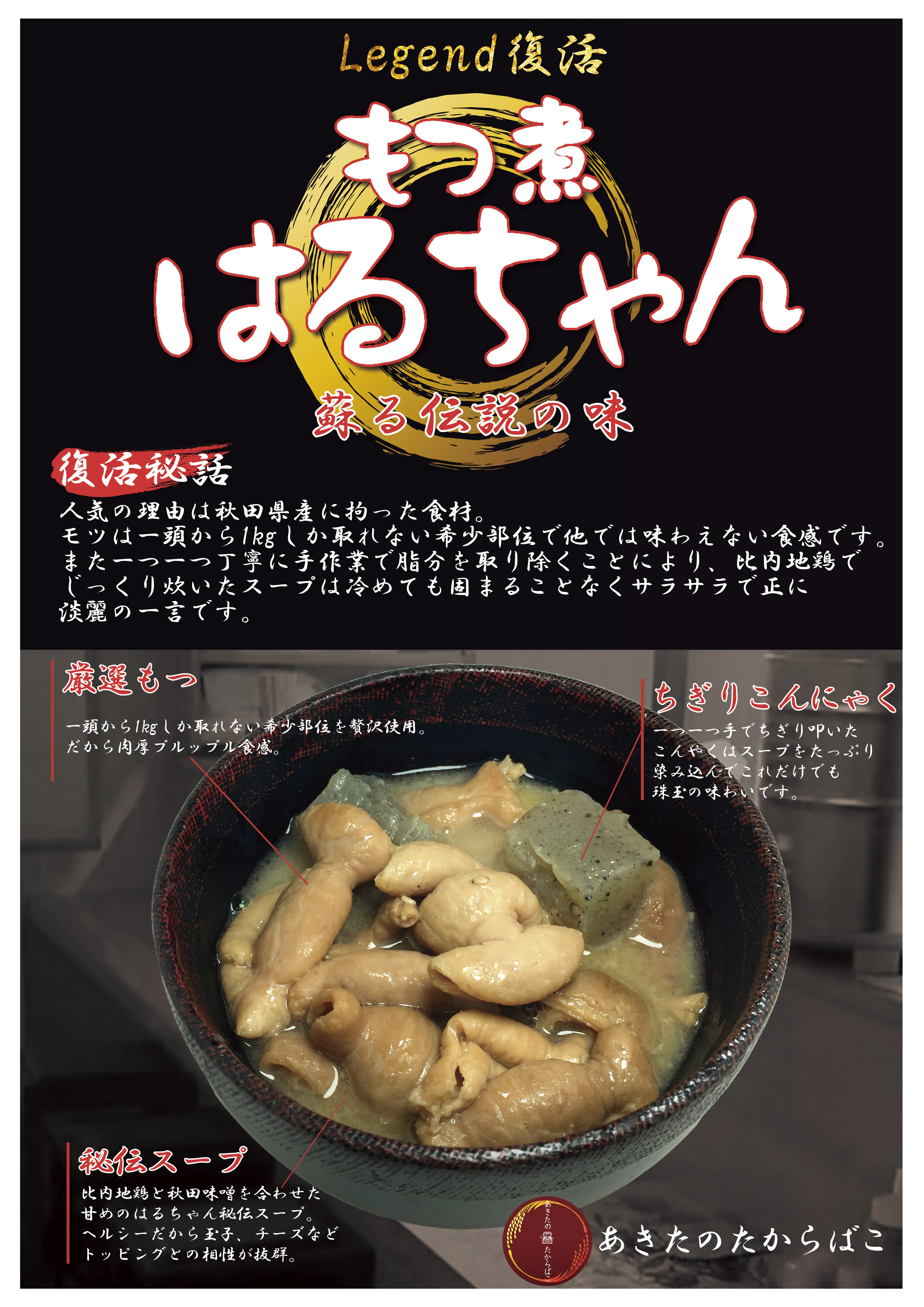 秋田市仁井田の食事処「もつ煮はるちゃん」 の看板メニューをレトルトで復刻しみんなに味わってほしいとの思いでこのプロジェクトを立ち上げました。「もつ煮はるちゃん」 の人気の秘密は秋田県産にこだわった食材です。もつは希少部位のみを使用、比内地鶏を使ったスープで炊きあげました。