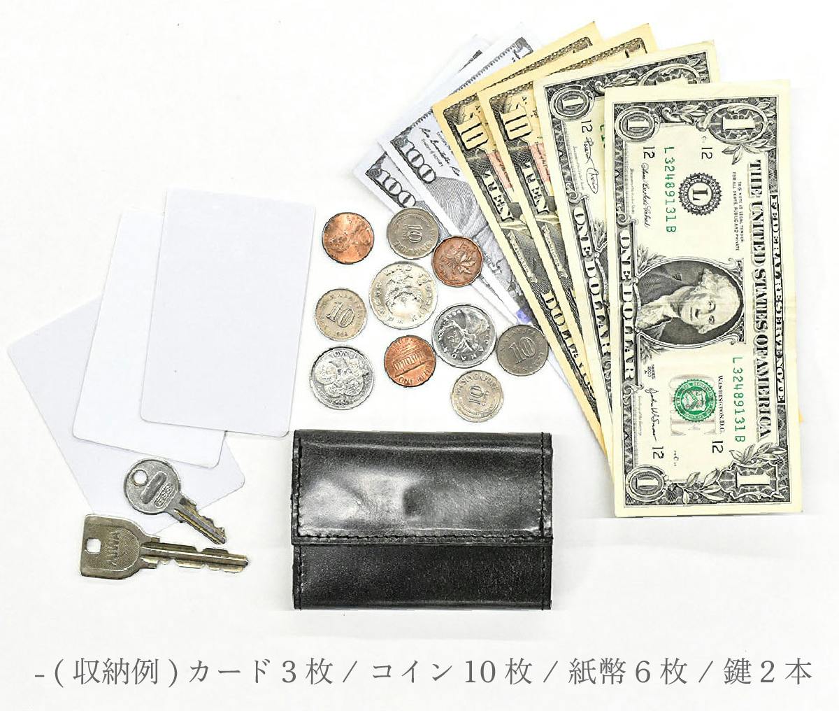 蓋のないコインポケットに、外側からもアクセスできる便利なカードポケットを配置。三つ折りを開くと長財布のように紙幣がピッタリ収まるので、この小ささで紙幣を折らずに収納できます。