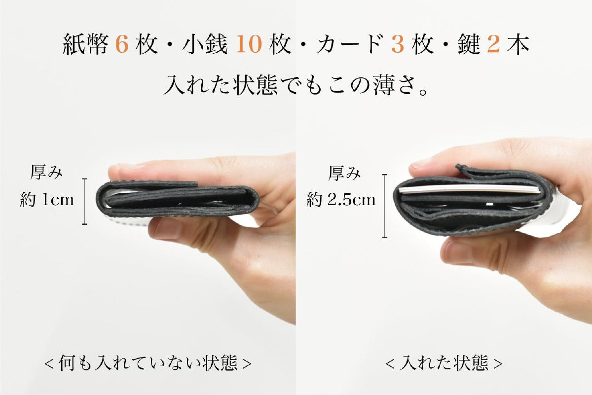 金具を無くし、厚み約1cmの薄さを実現した小銭入れ