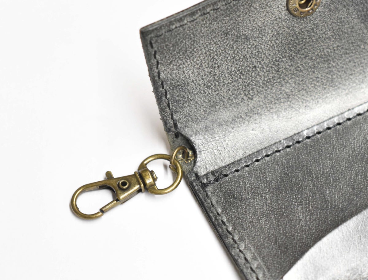 財布の裏側に1ヶ所リングを設置し、ストラップなどを取り付けれるようにしました。