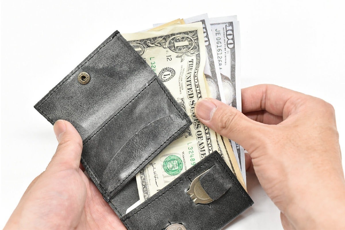 蓋のないコインポケットに、外側からもアクセスできる便利なカードポケットを配置。三つ折りを開くと長財布のように紙幣がピッタリ収まるので、この小ささで紙幣を折らずに収納できます。