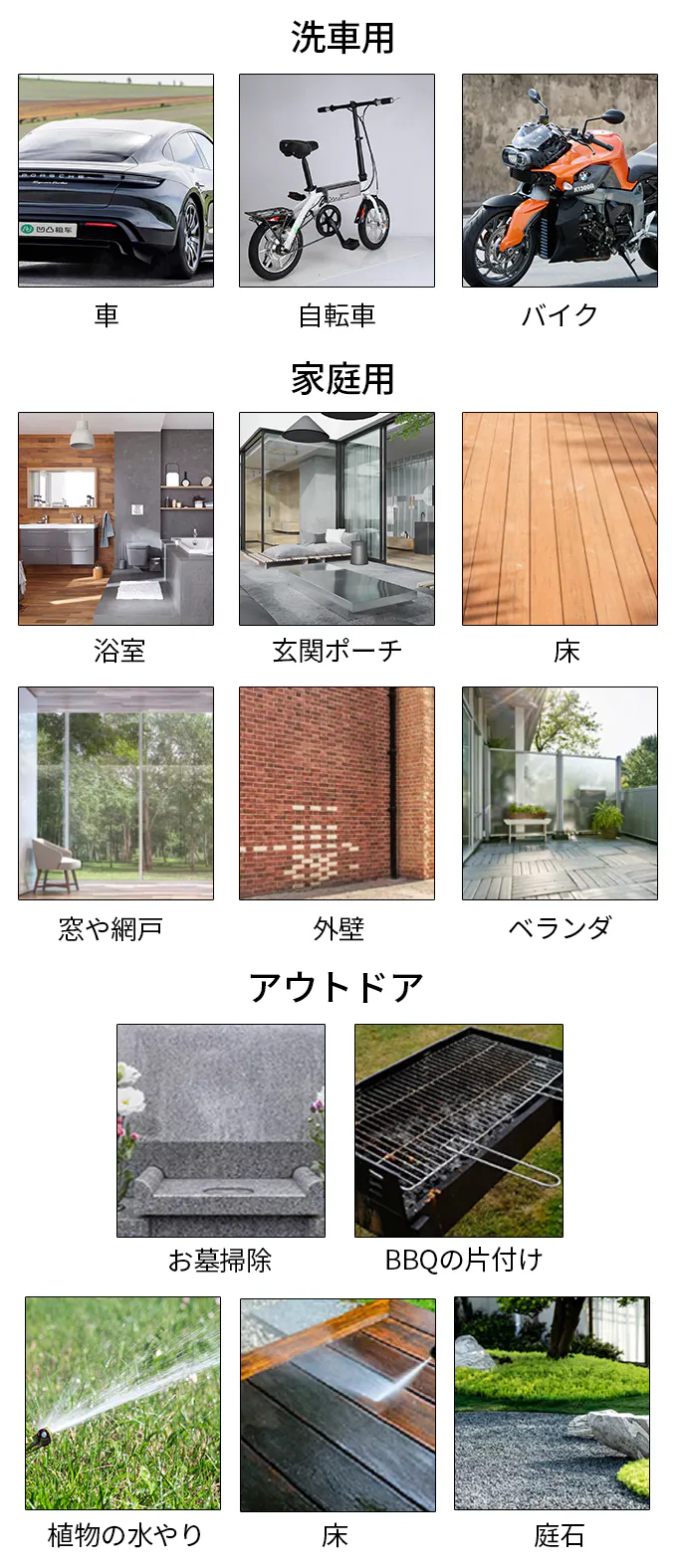 1.5kgの軽量さ&コンパクトデザインで持ち運びが便利。車やバイクの洗車から、コンクリートや家の外壁の汚れ、お庭やベランダなどあらゆる場所を水の衝撃力で洗い落とします。また、工具や農具の泥落としや、キャンプや釣り用品の洗浄など仕事から趣味にまで幅広く使用できます。