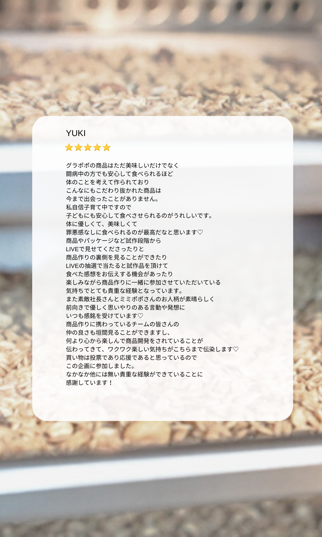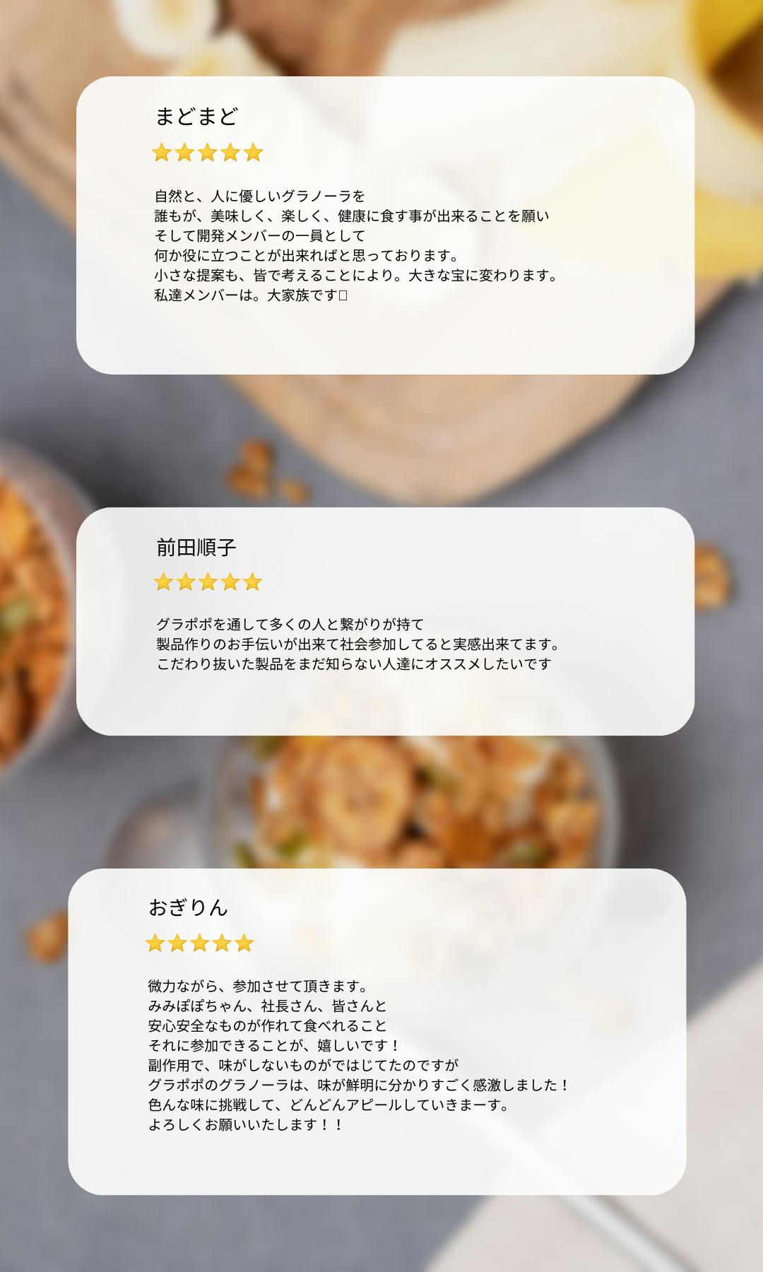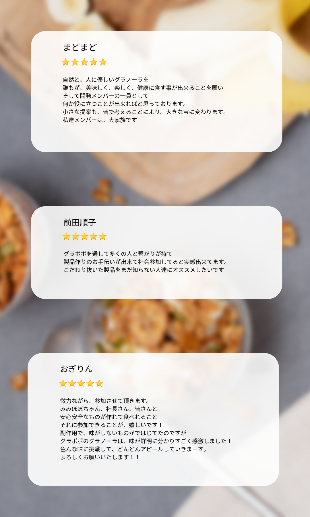 〈体に良いものであってもおいしくないと!〉をコンセプトに、グラポポメンバーに試食してもらい何度も改良を重ねました。毎日食べても飽きないおいしいグラノーラができあがりました。