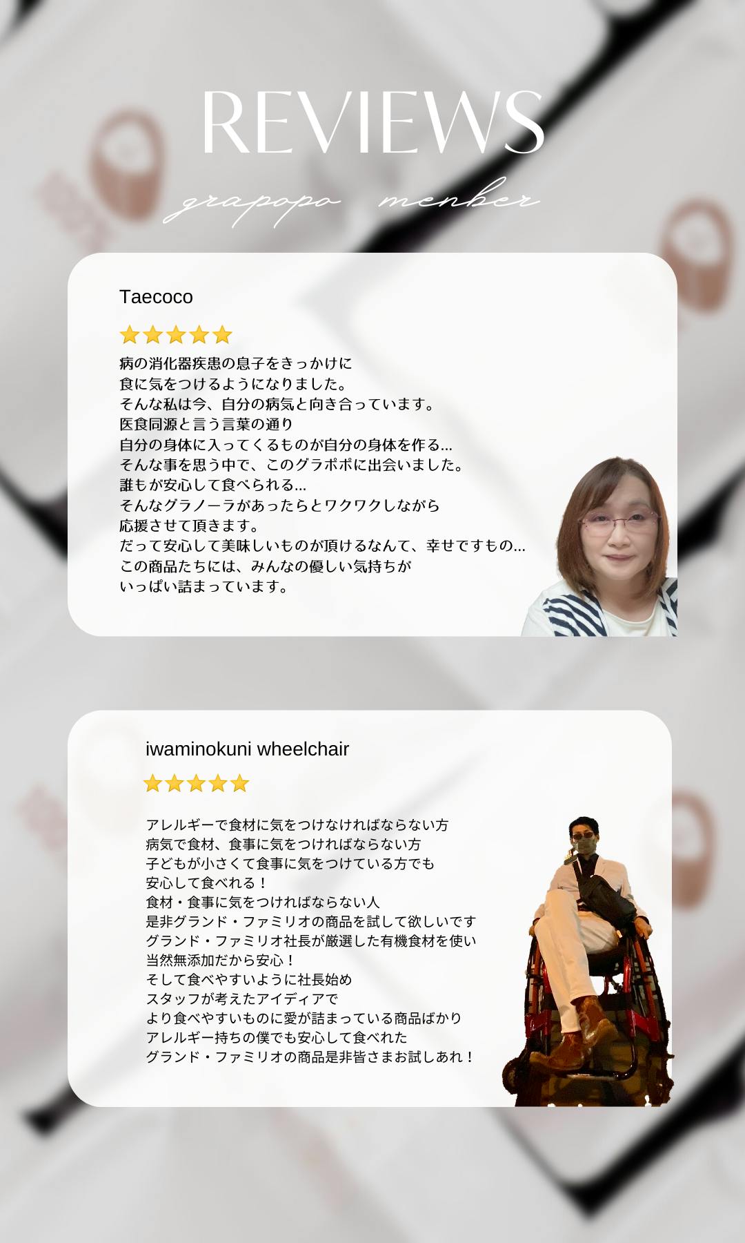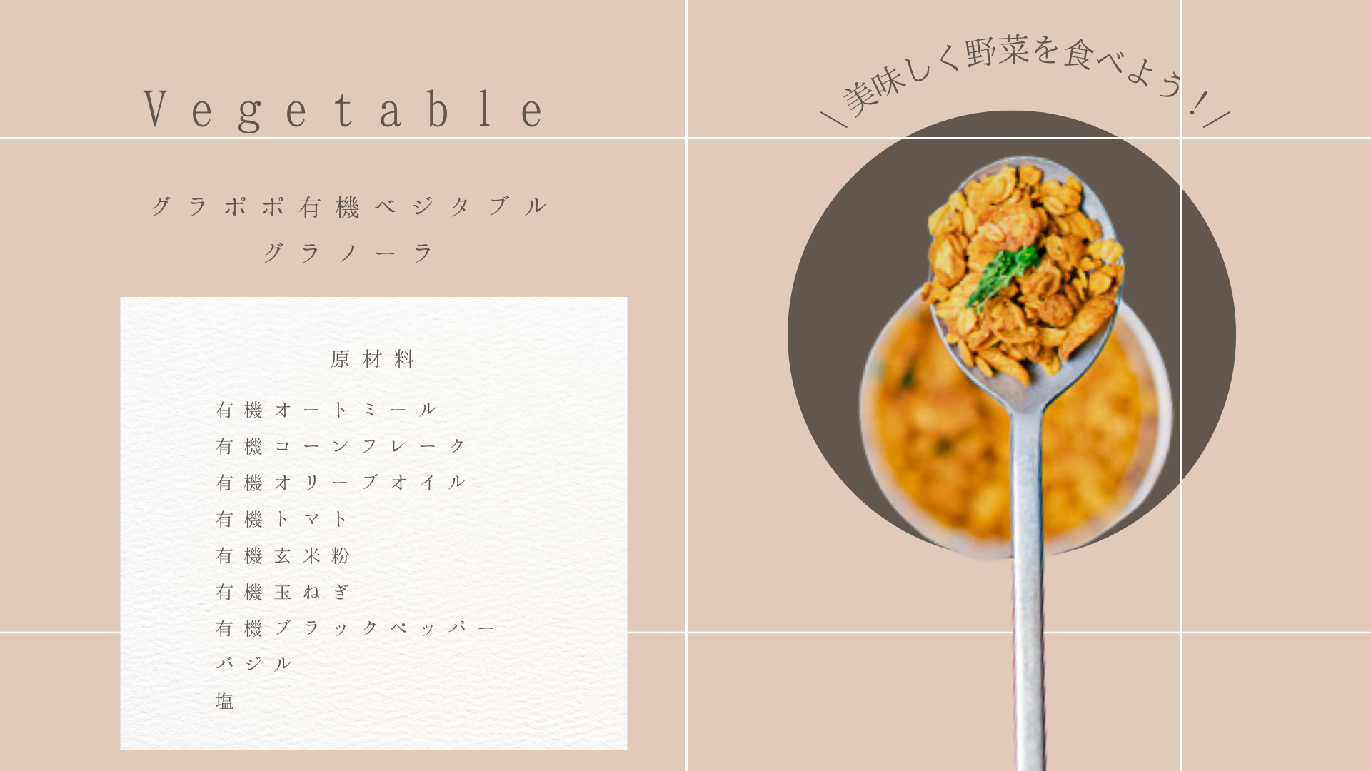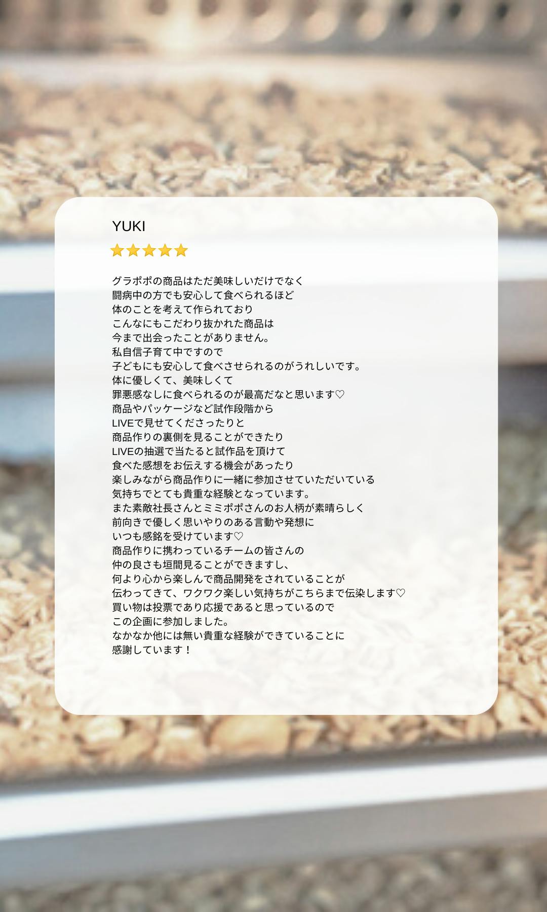 〈体に良いものであってもおいしくないと!〉をコンセプトに、グラポポメンバーに試食してもらい何度も改良を重ねました。毎日食べても飽きないおいしいグラノーラができあがりました。