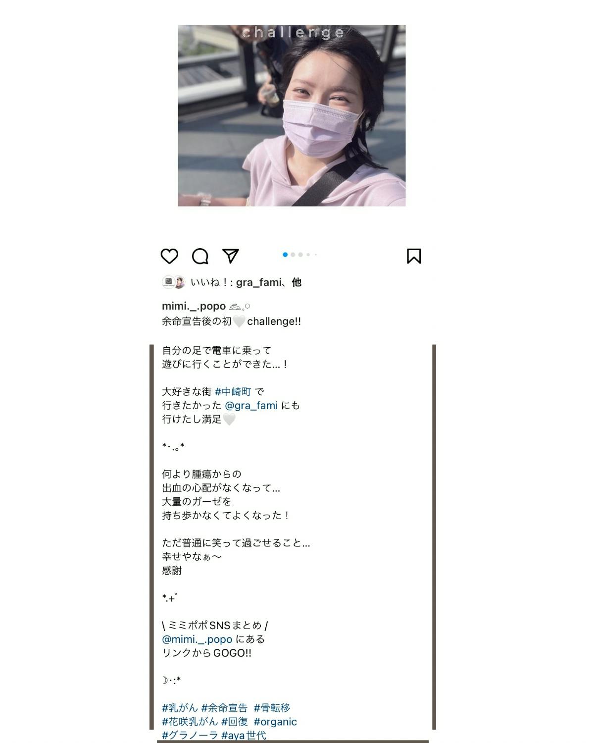 彼女は26歳のときに乳がんが発覚し、34歳のときに約2ヶ月の余命宣告を受けました。あれから3年経った今も闘病を続けながら、自身の体験"生きること"をSNSで発信しながら同じ闘病をされている方々の希望になっています。