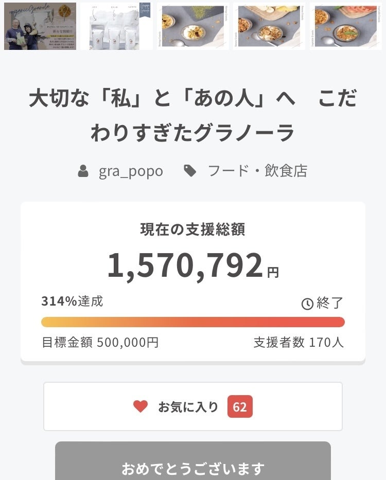 昨日でグラポポクラウドファンディングが無事に終了しました\(^o^)/たくさんのご支援のおかげで当初の目標から遥かに超える支援者170人300%の達成率を叶えることができました!これもクラウドファンディング開始前から一緒にたくさんのアイディアを出してくれたグラポポメンバーのおかげです私たちだけではここまでの大成功は成し遂げれませんでした本当にありがとうございましたこのグラポポ企画だけでは終わらず今後も引き続き挑戦する姿勢でがんばっていきますのでご支援をよろしくお願いいたしますご購入いただいたリターンについては準備が整い次第送りますので楽しみにお待ちください心を込めて送ります٩( 'ω' )و