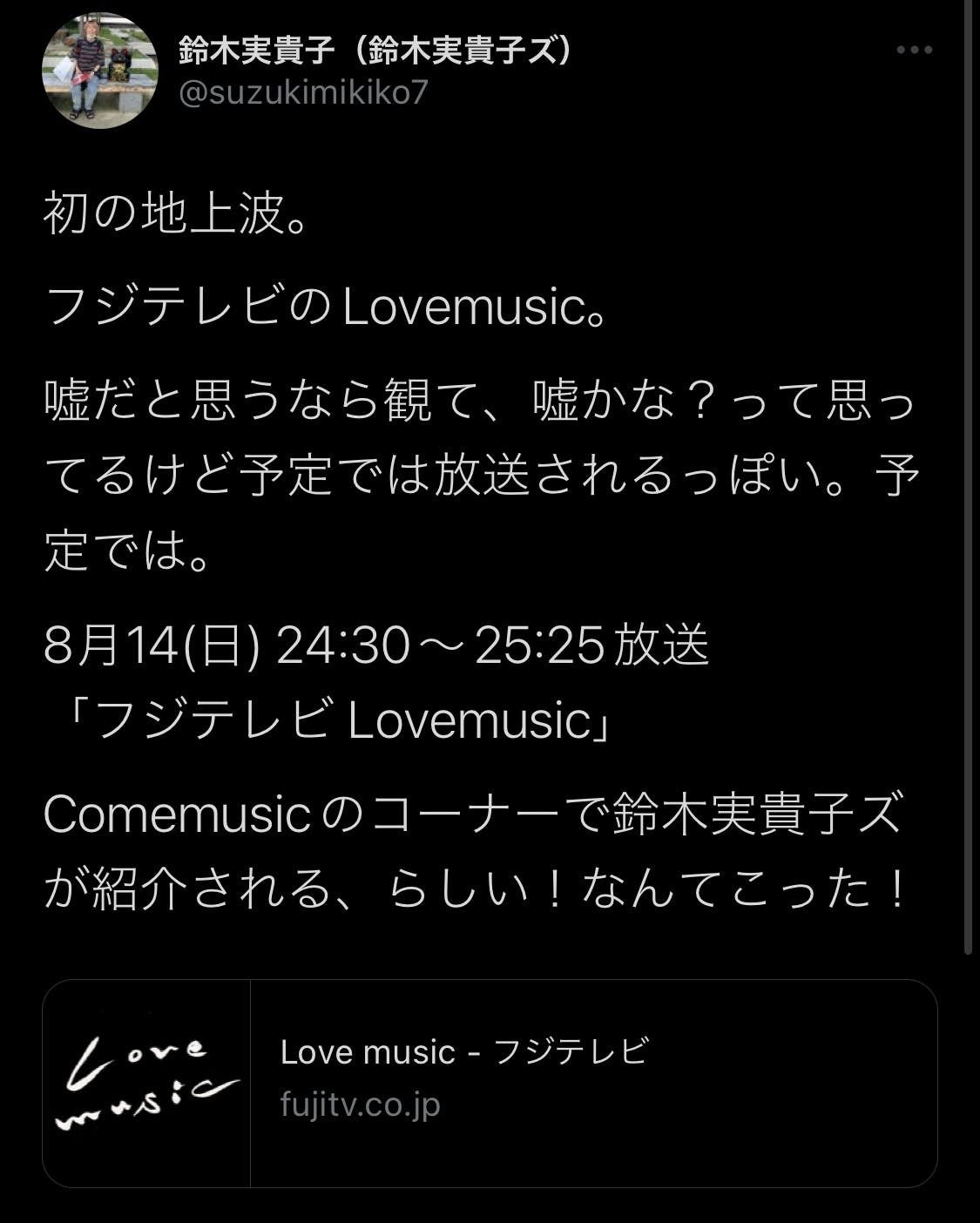 主題歌を描き下ろしてくださる鈴木実貴子ズがフジテレビで地上波デビューするとのこと!