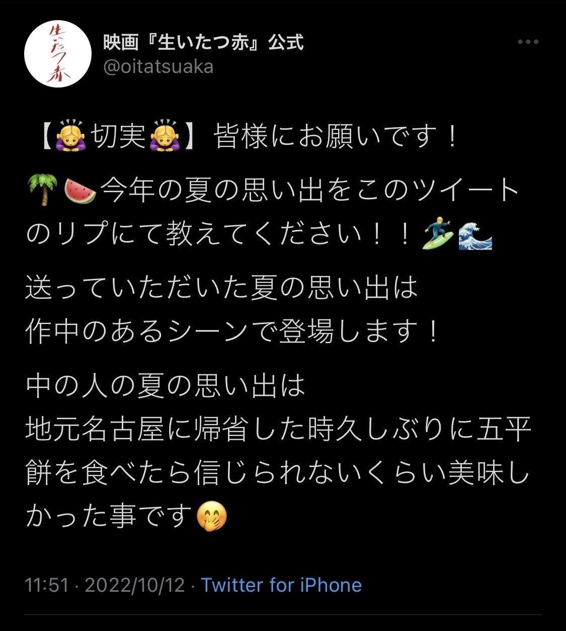 https://twitter.com/oitatsuaka/status/1580028422620782593?s=46&t=H1_4_JP4O3sx3-zCYKGMKw公式Twitterのツイートに返信で是非お送りください!お送り頂いた思い出は劇中のあるシーンで登場致します!宮原悠