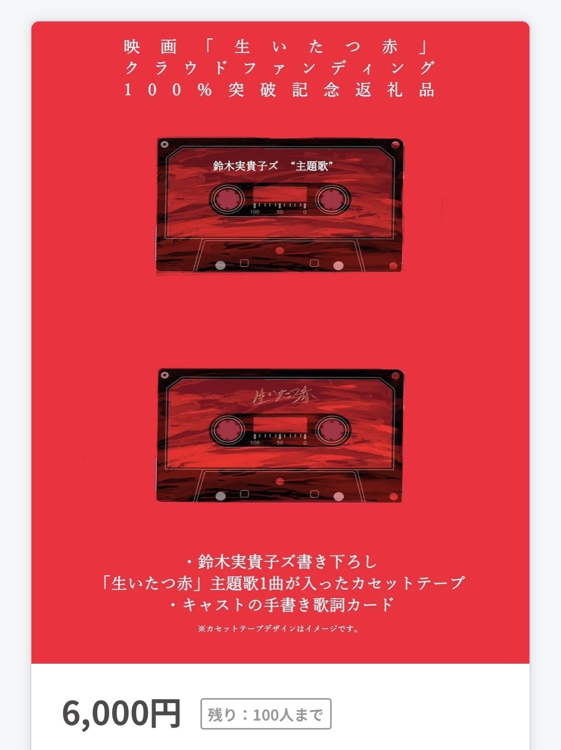 クラウドファンディング100%達成記念返礼品として新たに■鈴木実貴子ズ書き下ろし「生いたつ赤」主題歌収録カセットテープ(非売品)&全キャストによる手書き歌詞カードetc…本日9月26日〜9月30日までの4日間限定で受付開始となりました。数量限定でございますのでこの機会に是非映画「生いたつ赤」のご支援と併せてよろしくお願いします!宮原悠