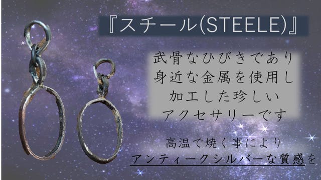 『スチール(STEELE)』という武骨なひびきであり身近な金属を使用し加工した珍しいアクセサリーです。ロウ接部分は銀ロウを使用しております。しかも1000度以上の高温で焼く事によりアンティークシルバーな質感を出す事ができると技術的に研究を重ねた結果分かりました☆メンズでも武骨な質感なので身に着けやすいです!