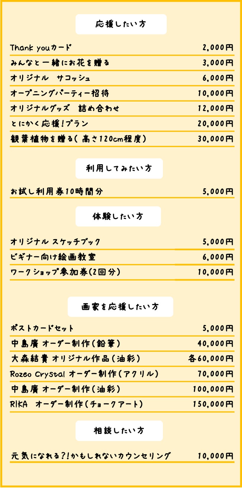 イーゼルや作業台を無料貸出するなど、絵を描くための快適な環境を提供するほか、会員同士の交流・コラボ、インスピレーションが生まれるイベントを開催し、絵を描く方々を応援します。そして、応援してくださる方々へお返ししていけるような場所を作り上げていきたいと考えております。