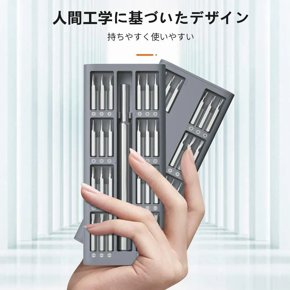 スタイリッシュな収納ケースの両面にビットが収納されていて、コンパクトで持ち運びしやすいです。ケース側面を一度押し込むことで中身が引き出せる仕組みです。中身は本体とビットが両方の面に収納できます!