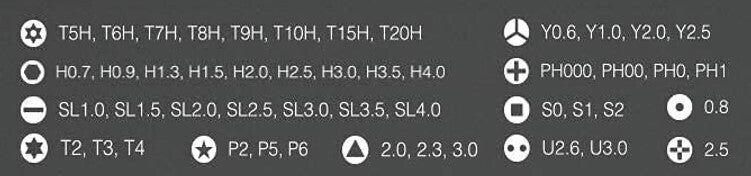 セットツールはPENDORA 48E SETのみ入っております。左→右の名前の順番は以下となります: