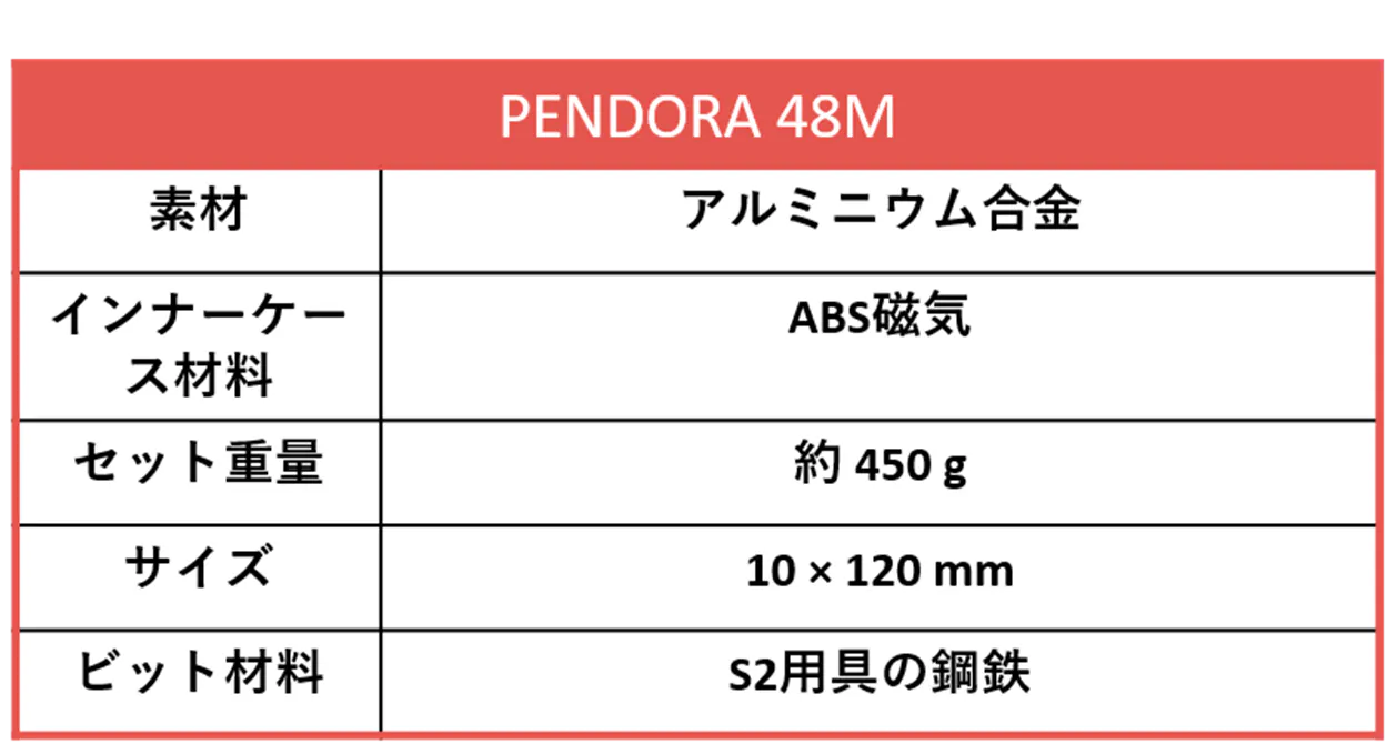 A. PENDORA 48Eには48個、PENDORA 48Mには30個のビットを用意しております。