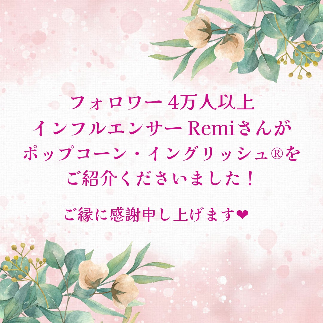 フォロワー4万人以上の素敵なインフルエンサー Remi さんとのご縁を頂きRemiさんのInstagram でポップコーン・イングリッシュ(R) をご紹介いただきました!こちらをクリックして見て下さいね! ↓https://www.instagram.com/cccekaa/"English"というタイトルの画像でポップコーン・イングリッシュ(R) を「無理なく楽しく始められるので オススメです!」とご案内いただいていますRemiさんのハッシュタグには、「トリリンガル育児」(*「トリリンガル=3ヶ国語」)「海外留学」「食品添加物マイスター」や「薬膳マイスター」などがあります語学教育だけでなく、「体にやさしい食品」という私が最近興味のある面へも興味をお持ちです。こんな素敵な方と指向性の共通点があるだけでもまゆみん♪はとても嬉しいですがさらにポップコーン・イングリッシュ(R) に興味を持って ご紹介くださり、本当に嬉しいです\(^~^)/このご縁に心から感謝申し上げます素敵なご縁からもパワーをもらい10/30まで楽しく活動続けます!どうぞご支援をよろしくお願いいたします!