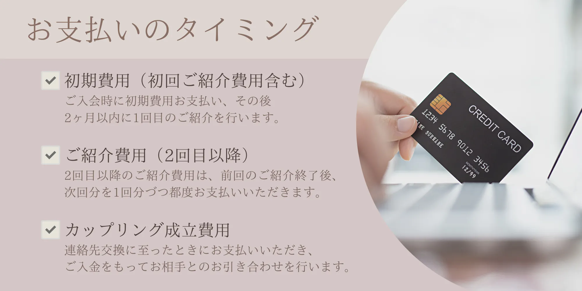 初期費用(初回ご紹介費用含む)、ご紹介費用、カップリング成立費用のみで月額費用もかからずわかりやすい料金体系でご案内しております。また、会員期間中最大6名様ご紹介して参りますが、活動しやすいよう料金設定をおこなっておりますのでご安心ください。