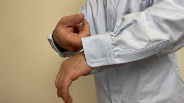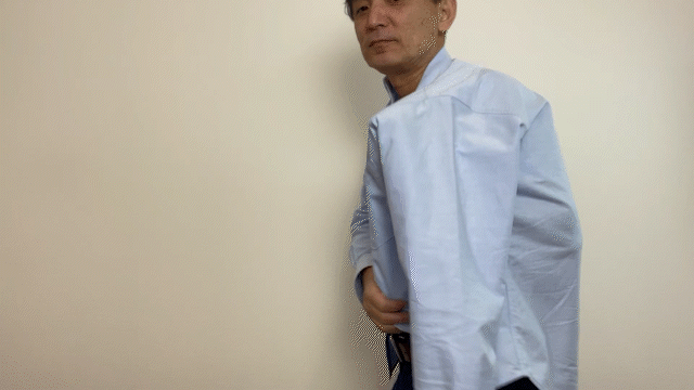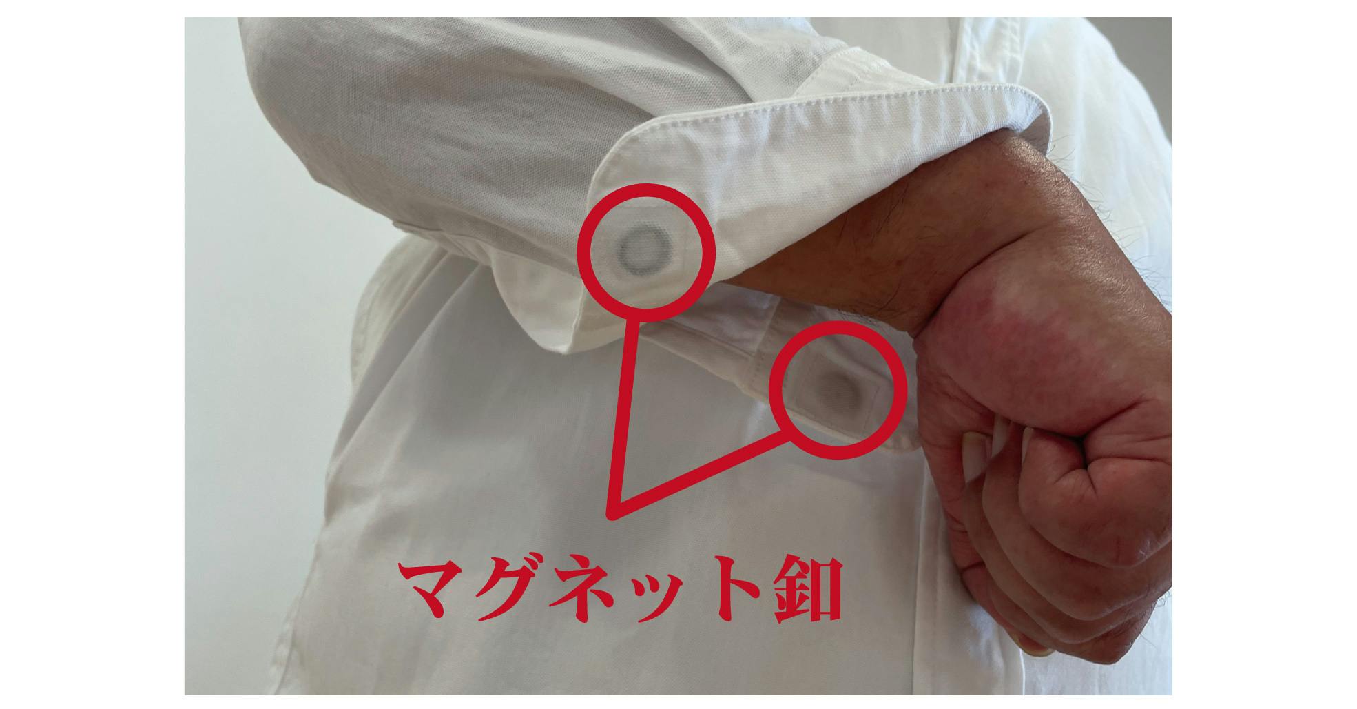マグネット釦のポイントは、カフスを大きく開くことが出来るので拘縮した手首を袖に通しやすいということです。