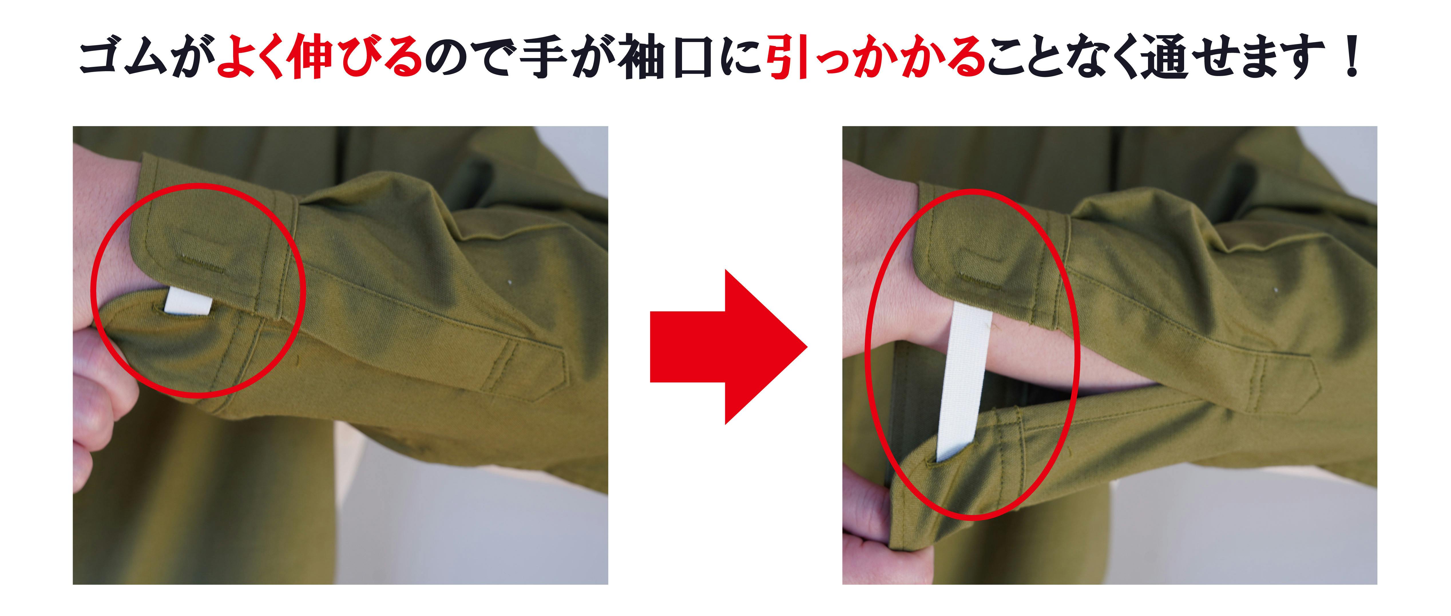 そで口のゴムは手で簡単に伸ばすことが可能です。