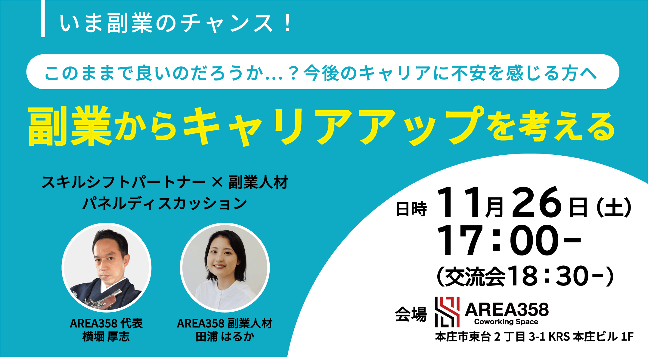 副業者のお一人「田浦はるか」さんをゲストにAREA358横堀とディスカッションの中から副業者の心理を知り、これから副業をお考えの個人の方や副業人材を使ってみようかと考えている事業者や企業の人事担当者の方に実際に生の声を知って頂く事が趣旨となります。この機会に 新しい働き方、副業・復業の事 考えるきっかけになれば幸いです。