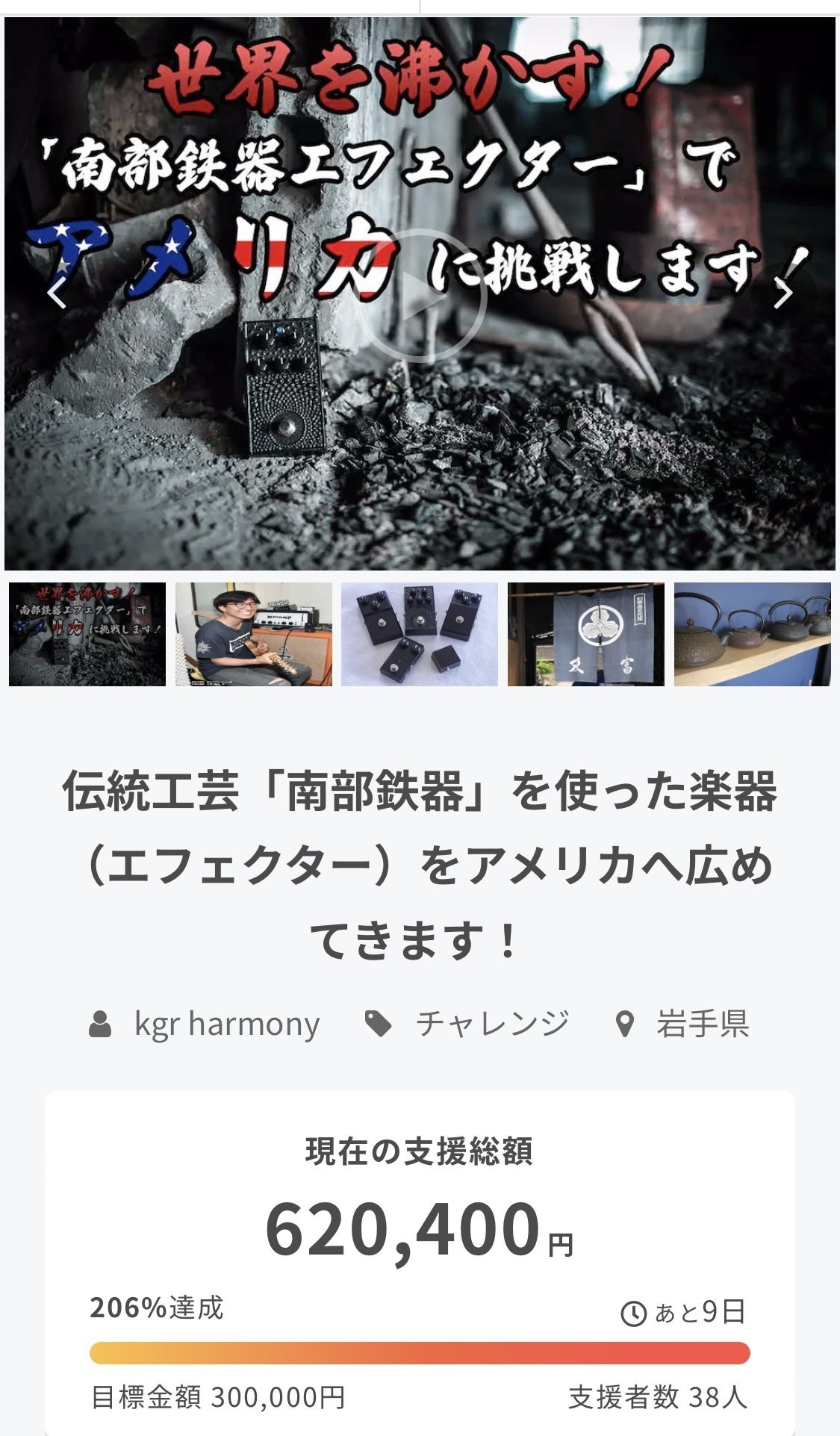 2022/09/12 00:05皆様、ご支援頂きありがとうございました!目標を大きく上回り、終える事が出来ました。本当に沢山の方が応援してくれているのを知り、勇気が湧きました。明日から、1週間ではありますが、アメリカ・シアトルと、内1日だけですが、カナダ・バンクーバーに行き、全力で南部鉄器エフェクターを広めてきます!本当にありがとうございました! もっと見る