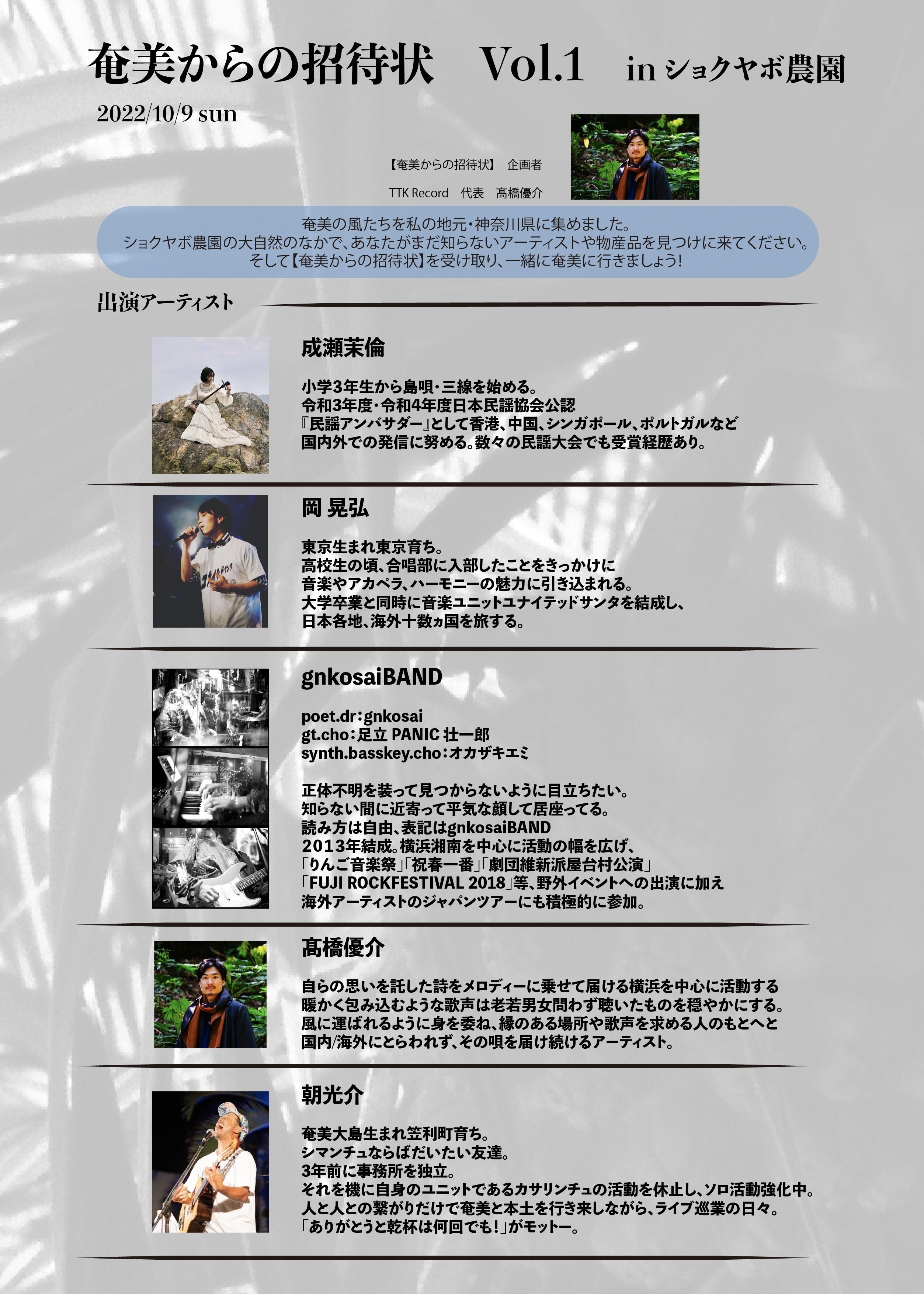 ショクヤボ農園の大自然の中で、あなたがまだ知らないアーティストや物産品を見つけに来てください。そして【奄美からの招待状】を受け取り、一緒に奄美に行きましょう!