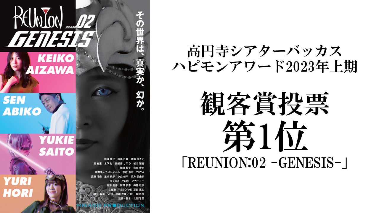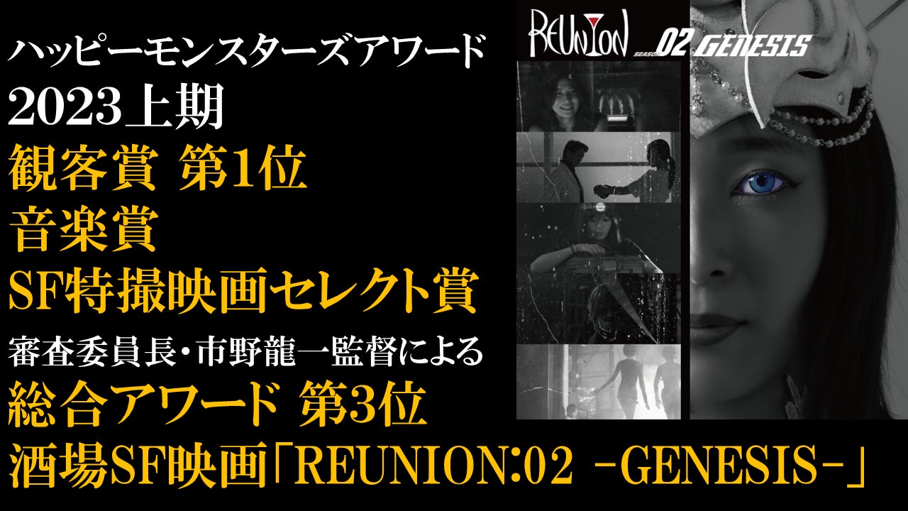 <アワード4冠を達成>2024年12月30日に高円寺シアターバッカスで授賞式が開催された「ハッピーモンスターズアワード2023上期」において、酒場SF映画「REUNION:02 -GENESIS-」は、観客賞・音楽賞・SF特撮映画セレクト賞・アワード総合3位を受賞しました。栄誉ある賞をいただきスタッフ・キャスト一同、深く感謝申し上げます。今後も酒場SFシリーズの認知拡大、2024年は海外上映へとチャレンジを続けてまいります。2026年公開を計画中の酒場SF最終章「REUNION:03」にもどうぞご期待ください。三門プロダクション 代表北御門潤--------1月2日(火)18時~ 高円寺シアターバッカスで酒場SFシリーズ新春一挙上映!チケット絶賛発売中↓https://yukukuru-hpmn.peatix.com「REUNION:01~その夜の終りに~」(51分)「RISE OF SHINJOE」(17分)※休憩有「REUNION:02 -GENESIS-」(60分)アフタートーク:アカイメイ(01主題歌提供、02出演)Josh Surface(02楽曲提供、03出演予定)---------審査委員長・市野龍一監督によるアワード講評-3位『REUNION:02 -GENESIS-』北御門潤監督「圧倒的なビジュアルのデザインワークスと、超絶技巧が光るギミック群が、観るものを問答無用でSF空間に連れて行ってくれる。女性は皆さん美しく魅力的で、お店の設定も面白い。ただ1点、残念なのは、カメレオールさんが首ちょんぱして退場しちゃったことでしょうか。」市野龍一(いちの・りゅういち)1999年『ウルトラマンガイア』にて円谷プロダクションの特撮ドラマに参加。2019年『ウルトラマンタイガ』でメイン監督を務める。2021年より自ら原作・脚本・監督を手掛ける配信連続SFドラマ『Angel Sync 333』を制作。「ハッピーモンスターズアワード2023上期」受賞作品一覧※審査は2023年4月~9月に上映された全70作品が対象-審査委員長 市野龍一監督による大賞セレクション-◆大賞溝井辰明監督「死後写真」◆第2位水野博章監督「はじめて」◆第3位北御門潤監督「REUNION:02 -GENESIS-」◆第4位ヤン・ハイデン・リー監督「レイズ・オブ・ザ・サイボーグ」(台湾)◆第5位坂田航監督「相対性浪漫飛行」-部門賞-◆シアターバッカス賞ヤン・ハイデン・リー監督「レイズ・オブ・ザ・サイボーグ」◆HappyMonsters賞岡本崇監督「ディスコーズハイ」◆SF特撮映画セレクト賞北御門潤監督「REUNION:02 -GENESIS-」◆ショートフィルムワンダーランド賞水野博章監督「はじめて」◆聖咲奇奨励賞桐生あすか(外世界Xシリーズの翻訳に対して)◆職業怪人カメレオール賞堺三保監督「オービタル・クリスマス」◆真柳美苗賞ヤン・ハイデン・リー監督「レイズ・オブ・ザ・サイボーグ」◆クリエイター賞ヤン・ハイデン・リー(レイズ・オブ・ザ・サイボーグ)溝井辰明(死後写真)◆コンセプト賞近藤勇一監督プロデュース「外世界X」シリーズ※レベルの高い海外自主制作SF映画を国内に紹介◆キャラクター賞稲葉司監督「おっぱいロケットガール」より「オウハ」(紺野みいな)◆俳優賞ヤン・ハイデン・リー(レイズ・オブ・ザ・サイボーグ)◆音楽賞岡本崇監督「ディスコーズハイ」北御門潤監督「REUNION:02 -GENESIS-」◆観客賞※%は投票数における占有率1位『REUNION:02 -GENESIS-』45%2位『ディスコーズハイ』34%3位『ライズ・オブ・シンジョー』20%4位『REUNION:01』19%5位『テレパス川村』15%
