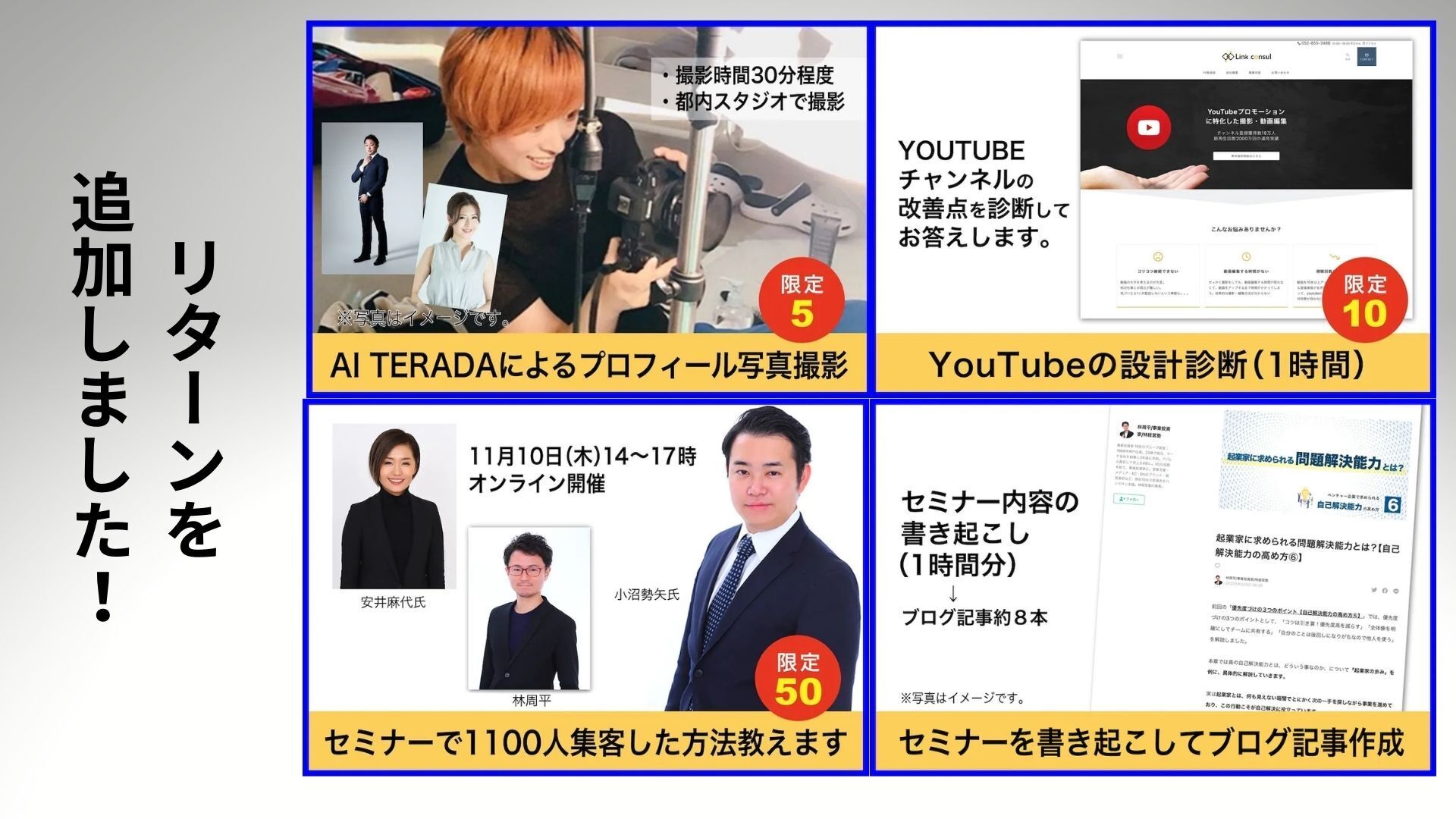 普段ビジネスを一緒にさせていただいている仲間が割安でサービスを提供してくれますので、この機会に良ければご購入ください!