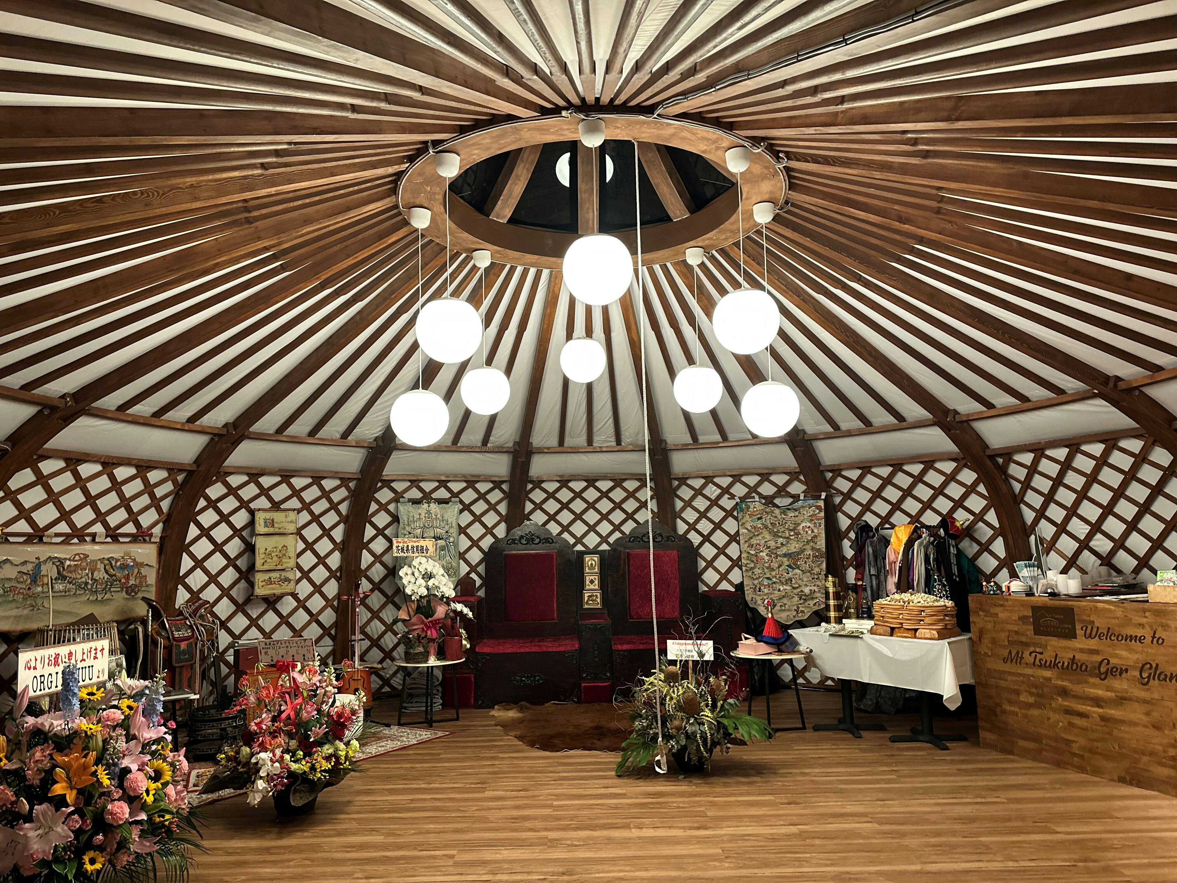 - 宿泊ゲルはモンゴルから直輸入。美しい木材が骨組みの現代風の内装。