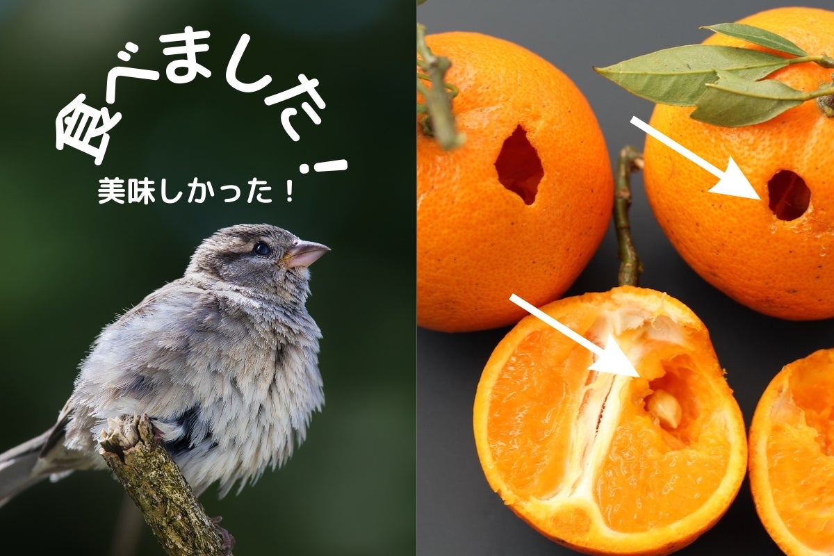 さらに心地よくご使用いただきたいと考え、リフレッシュできる柑橘の香りがついています。これは、鳥についばまれて本来廃棄されてしまう柑橘類のタンカンの皮から抽出した精油の香りです。こちらがついばまれたタンカンの写真ですが、見事にくり抜かれていますね!