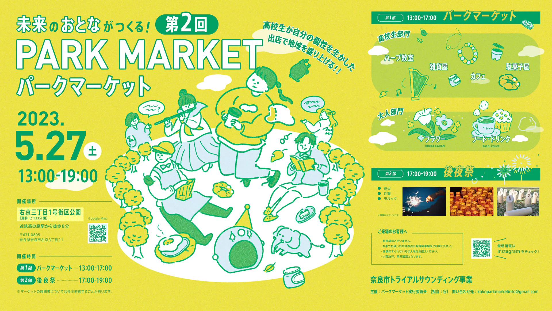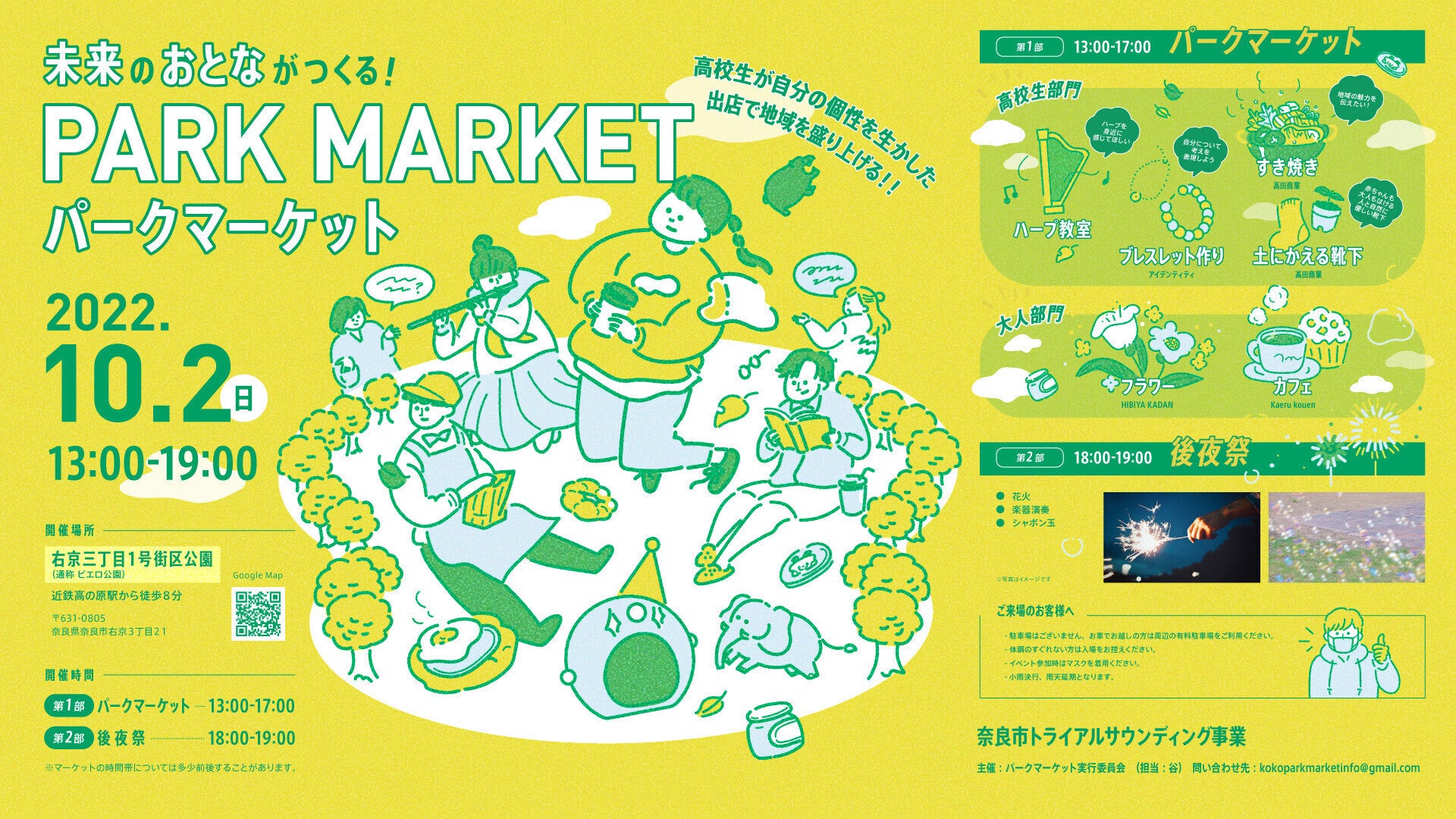 2023/05/15 17:59お世話になっております。パークマーケットプロジェクト実行委員会です。都度都度告知をさせていただいていますが、この度「第2回未来のおとながつくる!パークマーケット」を開催します。詳細はこちらからご確認ください。https://www.city.nara.lg.jp/site/parklife/151677.html日時 : 5月27日(土)13:00-19:00◎第1部 マーケット13:00-17:00【高校生店舗】ハープ教室・雑貨屋・みるく鹿せんべい屋・植物ワークショップ・駄菓子屋【大人店舗】高の原ばーるKaeruKouen・HIBIYA KADAN◎第2部 後夜祭 17:00-19:00花火・灯篭場所 : 右京3丁目1号区公園 map〒631-0805 奈良県奈良市右京3丁目21(近鉄高の原駅から徒歩7分)今回も高校生が自分の興味と向き合いお店を創り上げました。ぜひ高校生の挑戦を応援しに、そして楽しんでいただけると嬉しいです。また今回は花火や灯篭など、後夜祭コンテンツも充実!公園という場を自由に誰もが楽しめる場へと創り上げます。前回には負けないくらいワクワクな場を創り上げますので、ぜひ遊びに来てください!みなさんとお会いできるのを楽しみにしております。 もっと見る