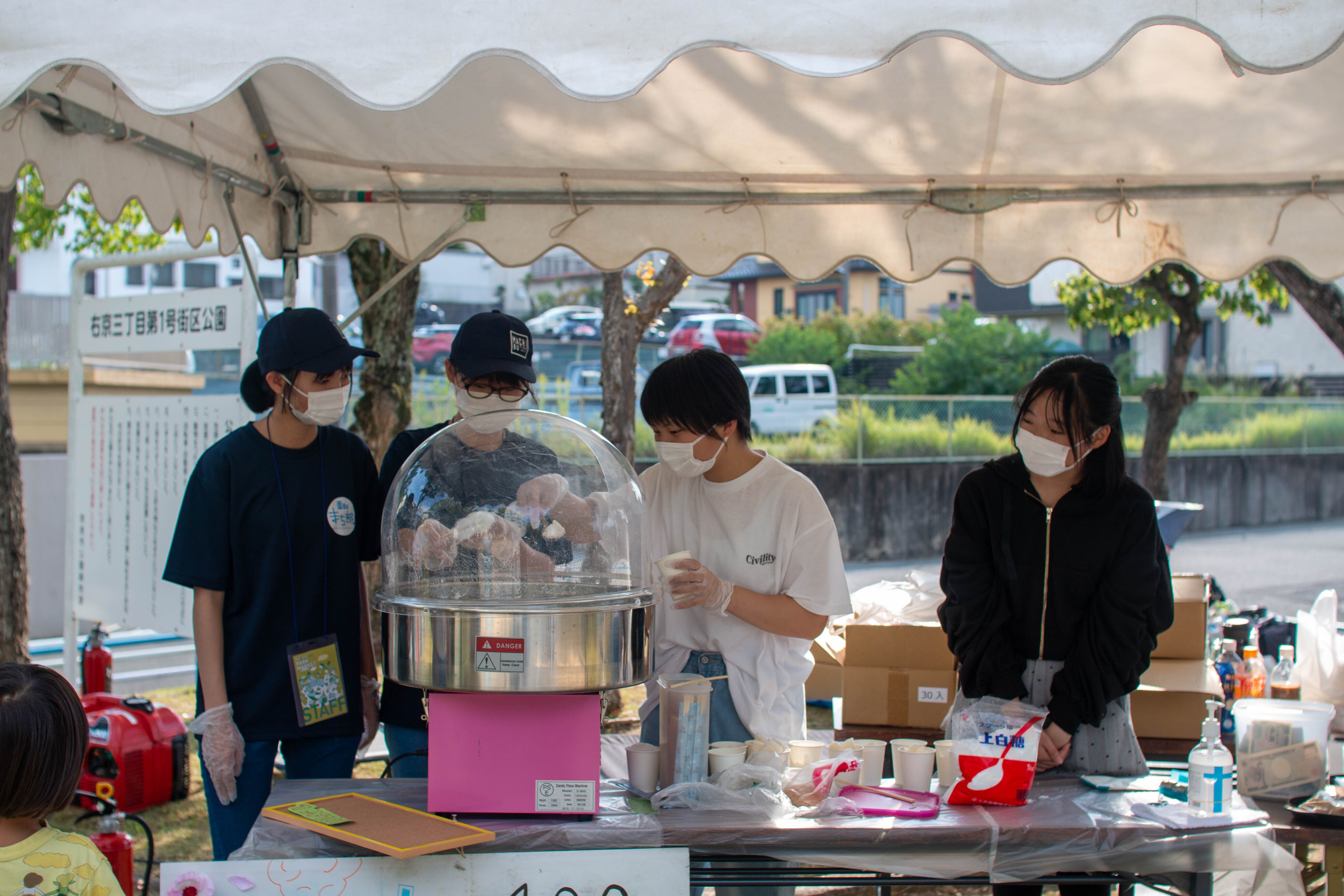 わたがし屋さんです。セルフで作ってもらって楽しむこともできるお店です。出店者は高田商業高校まち部。今回の企画は、比較的高い年齢に設定されているような部分もあり、小学生以下の子も来てもらったとき楽しめる店を、ということで企画しました。「まち部。」初の綿菓子屋です。子供にも大人にも楽しんでもらう綿菓子をつくります!