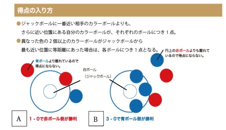 ③白いジャックボールに最も近い球の色のチームが勝ち(ボールの距離で得点が決まる)