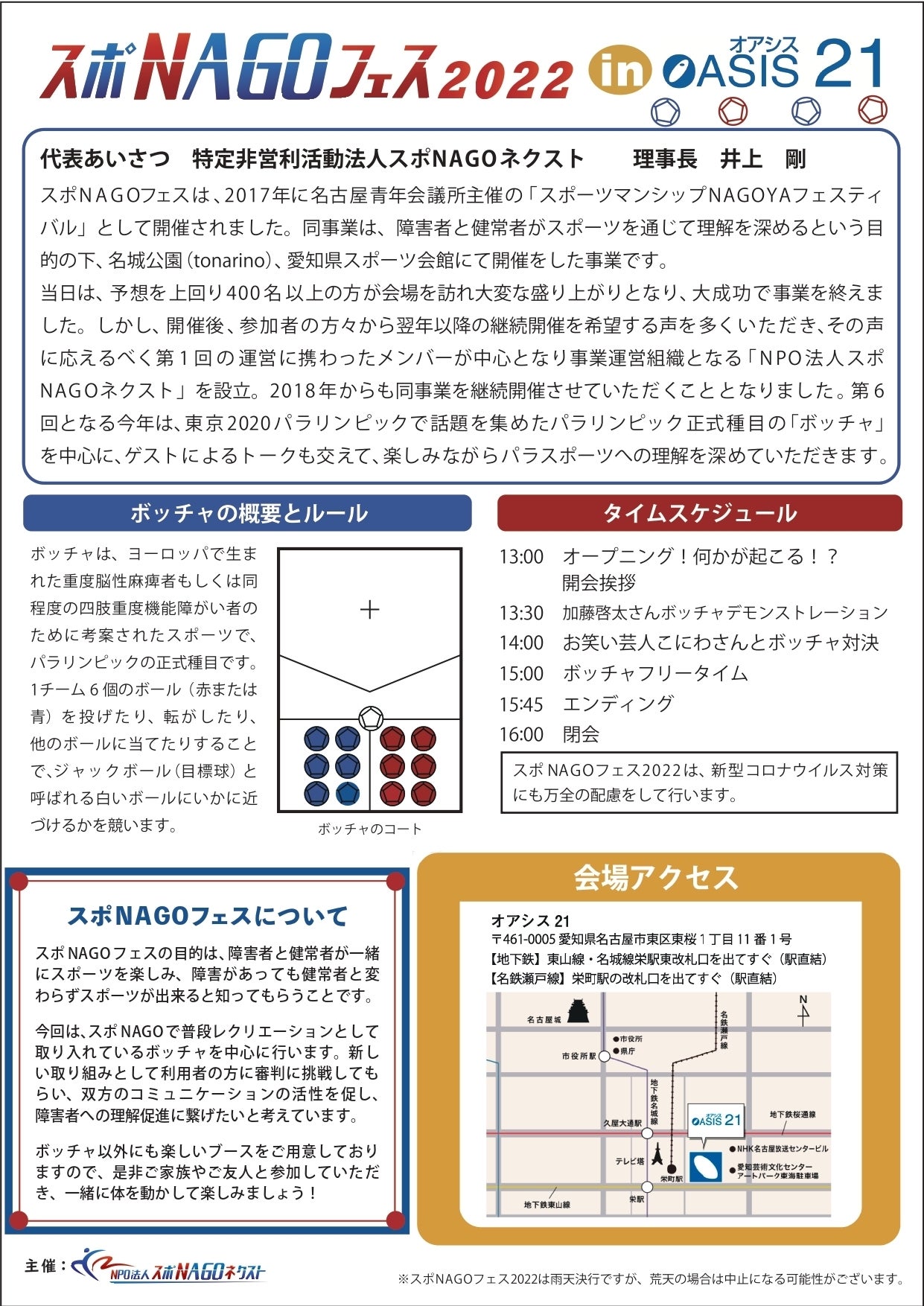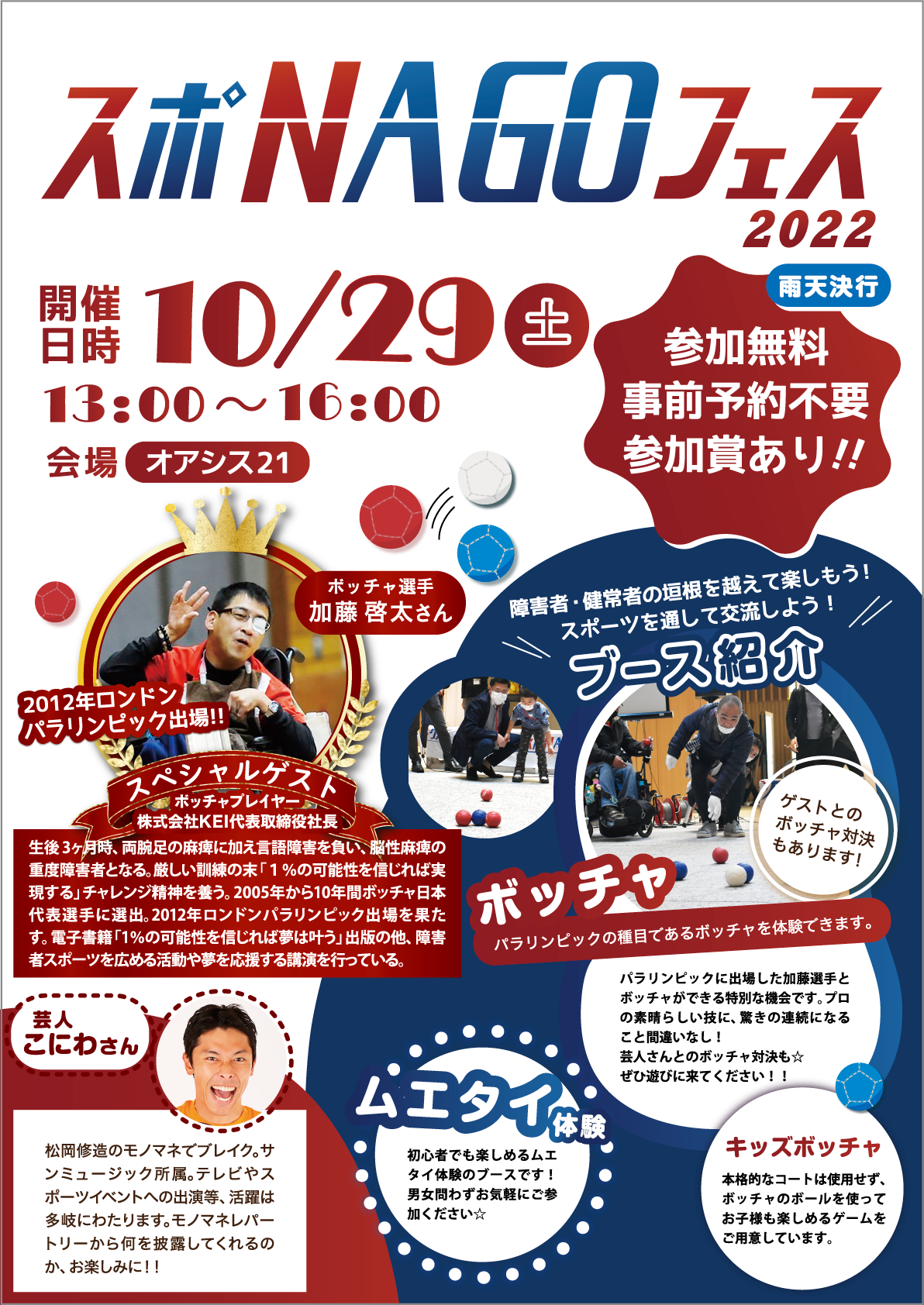 今年は10/29(土)に愛知県名古屋市中区にあるオアシス21のイベントブースをお借りして、ゲストに松岡修造さんのモノマネで有名なお笑い芸人のこにわさん、2012年ロンドンパラリンピック出場選手であるボッチャ選手である加藤啓太さんをお迎えして開催いたします。