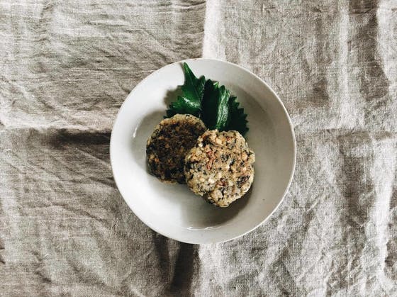 ・煎った桜えびを まぜあわせ、丸く成形。(4枚分つくるくらいのサイズが良い)