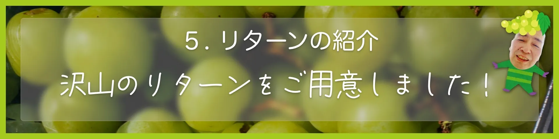 「シャインマスカットのお届け」から「ぶどう狩り権」まで、沢山のリターンをご用意させていただきました。