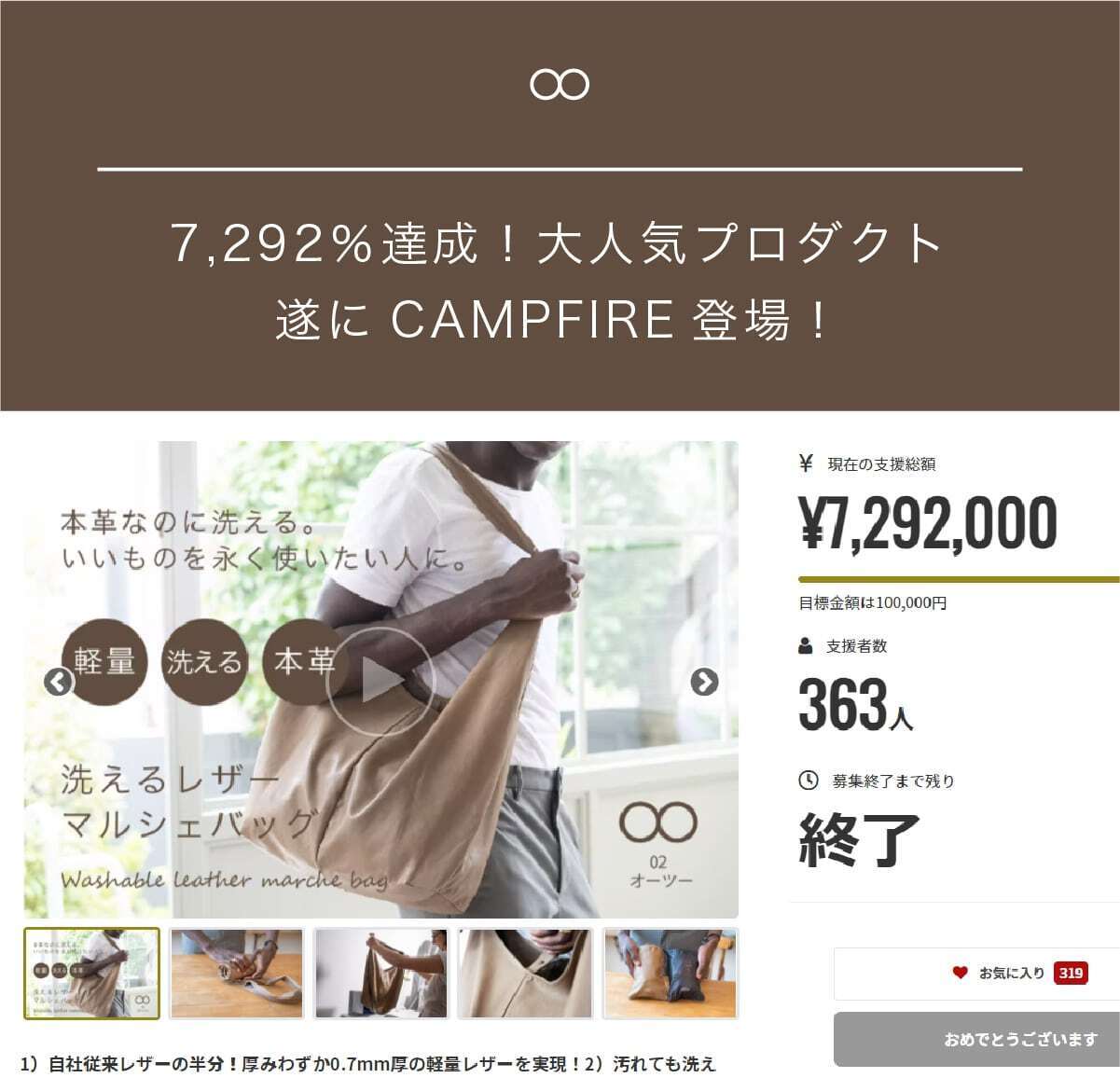 2023/01/26 10:15いつもお世話になります。大変お待たせしました。発送状況のご連絡でございます。昨日から本日にかけてリターンの発送が完了致しました。しかし、強い冬型の気圧配置で大雪、路面の凍結、交通規制等の影響で全国的に配送に遅れが生じております。ご不便をおかけいたしますがご理解、ご協力をお願いいたします。お届けまでもうしばらくお待ち頂ければ幸いです。今後もよりよいプロダクトを開発して皆様にご紹介させて頂ければ幸いです。引き続きampersandとO2(オーツー)をどうぞよろしくお願いいたします。ampersand一同 もっと見る- こんにちは、ampersandです。以前開催した「ミニマリストの洗えるレザーマルシェバッグ」が<CAMPFIREベストプロジェクト>にノミネートされました!!これも応援して下さった皆様のおかげです!今回なんと、CAMPFIREで1万円分のクーポンが当たる「お気に入り登録キャンペーン」のお知らせです。---------------------------------------------------<CAMPFIRE お気に入り登録キャンペーン>CAMPFIREのガジェット・プロダクトカテゴリーにおいて、話題となったプロジェクトのプロジェクトオーナーが、年末限定で新たなプロジェクトを実施します。当キャンペーンサイトに掲載中のプロジェクトから、3つ以上『お気に入り』に登録すると、抽選で20名様に、対象プロジェクトで使える10,000円分のクーポンをプレゼントいたします。https://camp-fire.jp/curations/favorite-campaign2022※参加締め切りは11月17日23:59まで---------------------------------------------------下記のプロジェクトを是非、「お気に入り登録」お願い致します!↓↓↓↓↓↓https://admin.camp-fire.jp/projects/635195/preview?token=1uwoug8nお気に入り登録数が多いプロジェクトが選出されますので、是非応援をお願い致します!また、プロジェクトの拡散・シェアのご協力頂ければ幸いです!どうぞよろしくお願い致します!!■【軽量×本革】ミニマリストの洗えるレザーマルシェバッグhttps://admin.camp-fire.jp/projects/635195/preview?token=1uwoug8n※参加締め切りは11月17日23:59まで! もっと見る