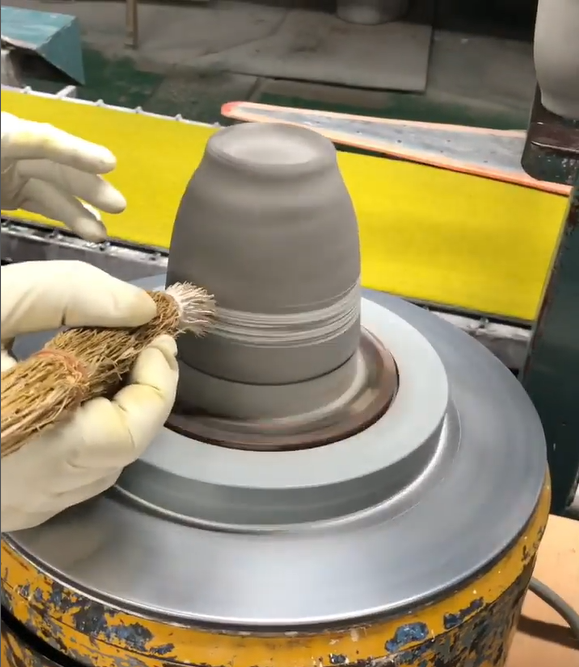 湯呑みに刷毛を入れている様子。まっすぐ引くには熟練の技が必要 焼き物の色や形、風合いもデザイナーをはじめ、たくさんの人が力を合わせて考え抜かれたものです。このことがお客様に伝わらず、「何となく」使われているのは、悲しいものです。