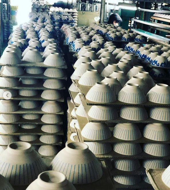 印刷されたお茶碗が、釉薬を掛けられるのを待っている様子