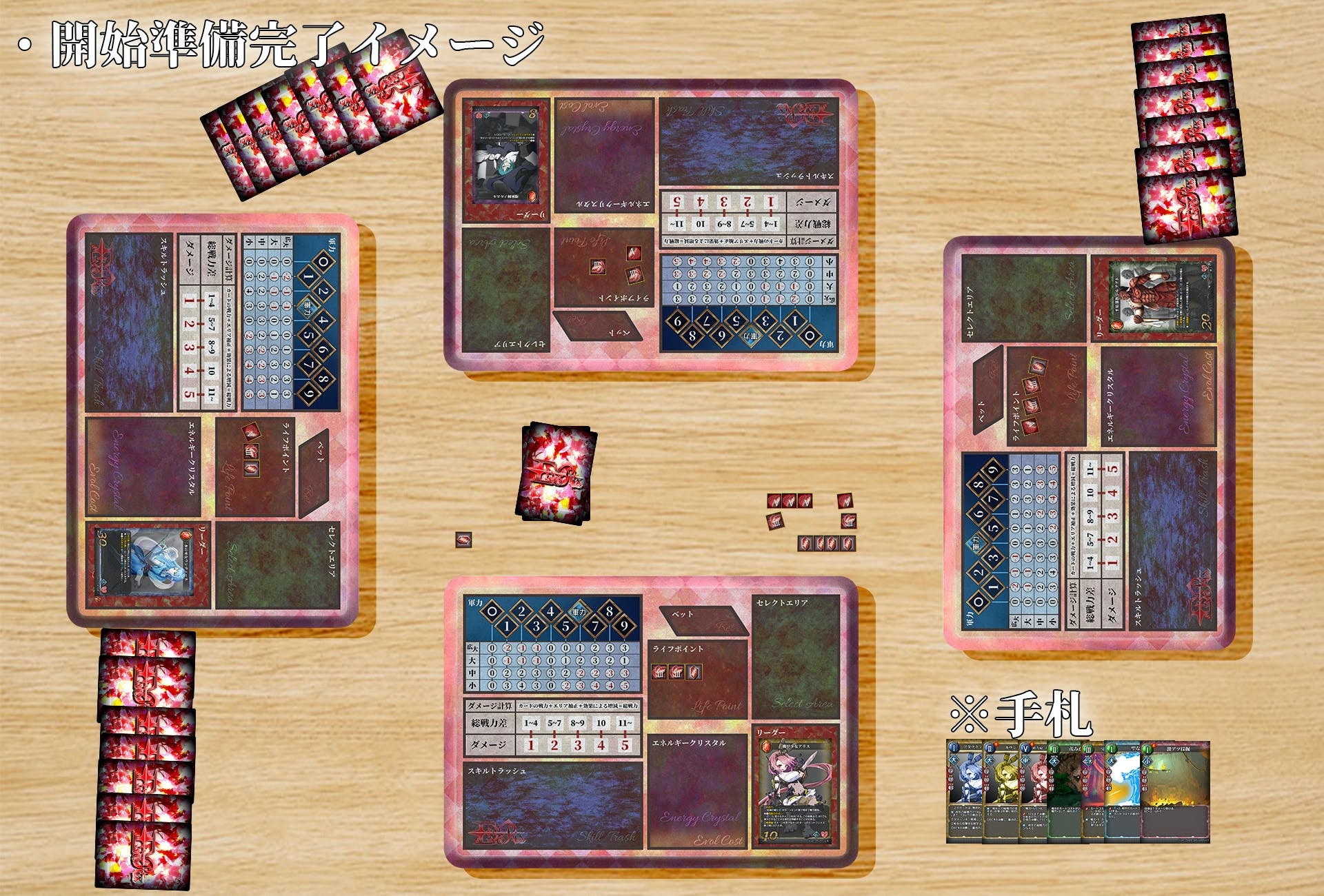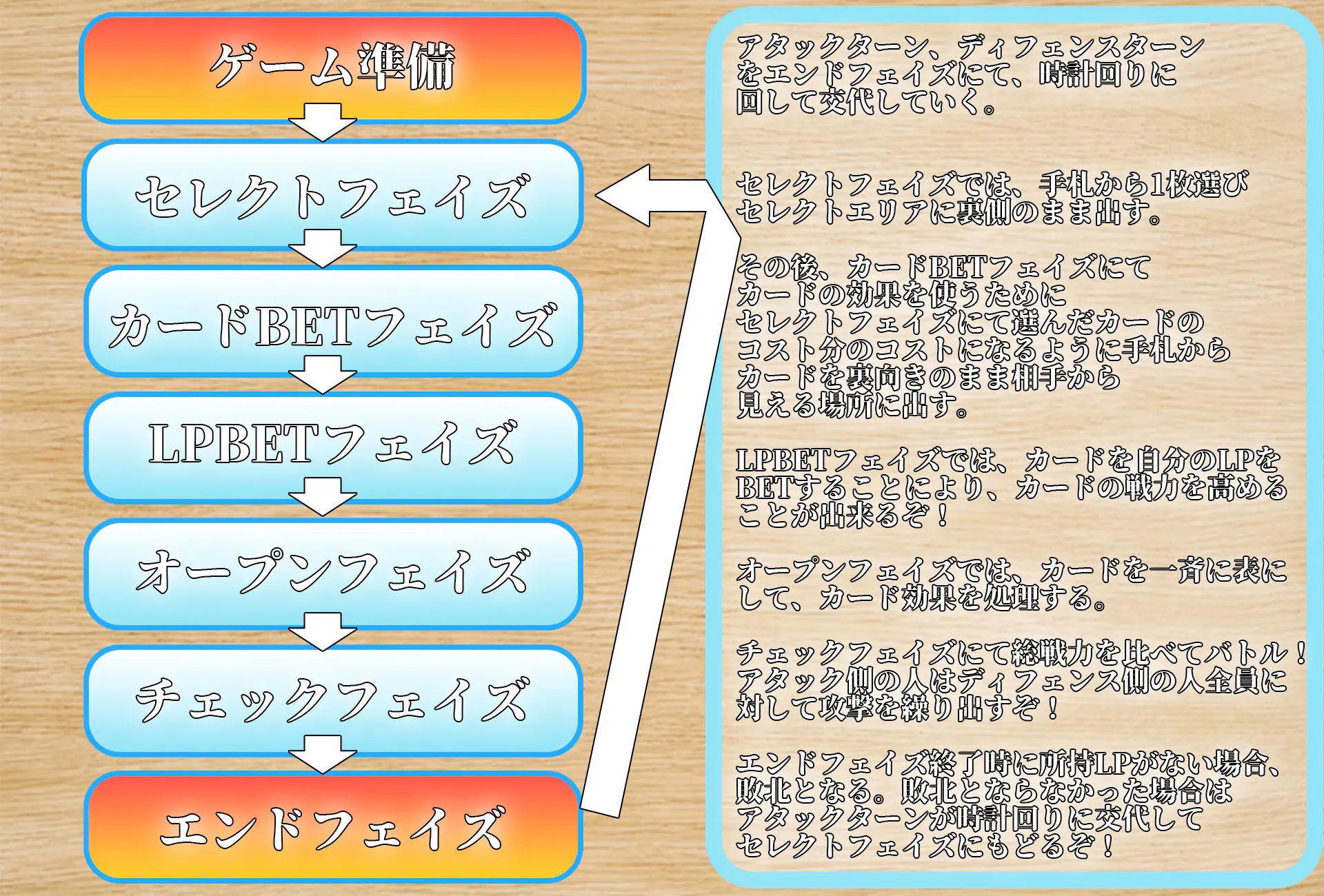 ゲームルールを簡単に説明すると 全員が共通の山札から手札を作り、全員同時にカードを裏向きでセットし、自身のライフ(命)を力へと変換し戦うライフBetをするのかどうかを決め、オープンフェイズで全員表にして戦力を競い合うゲームだ。