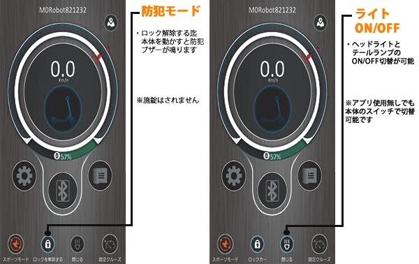 LCDモニターをON(もしくはアプリ上でON)にしブレーキレバーを握るとテールランプが点灯します。ヘッドライトを点灯させるとテールランプも同時に点灯するので夜間走行も安心です。