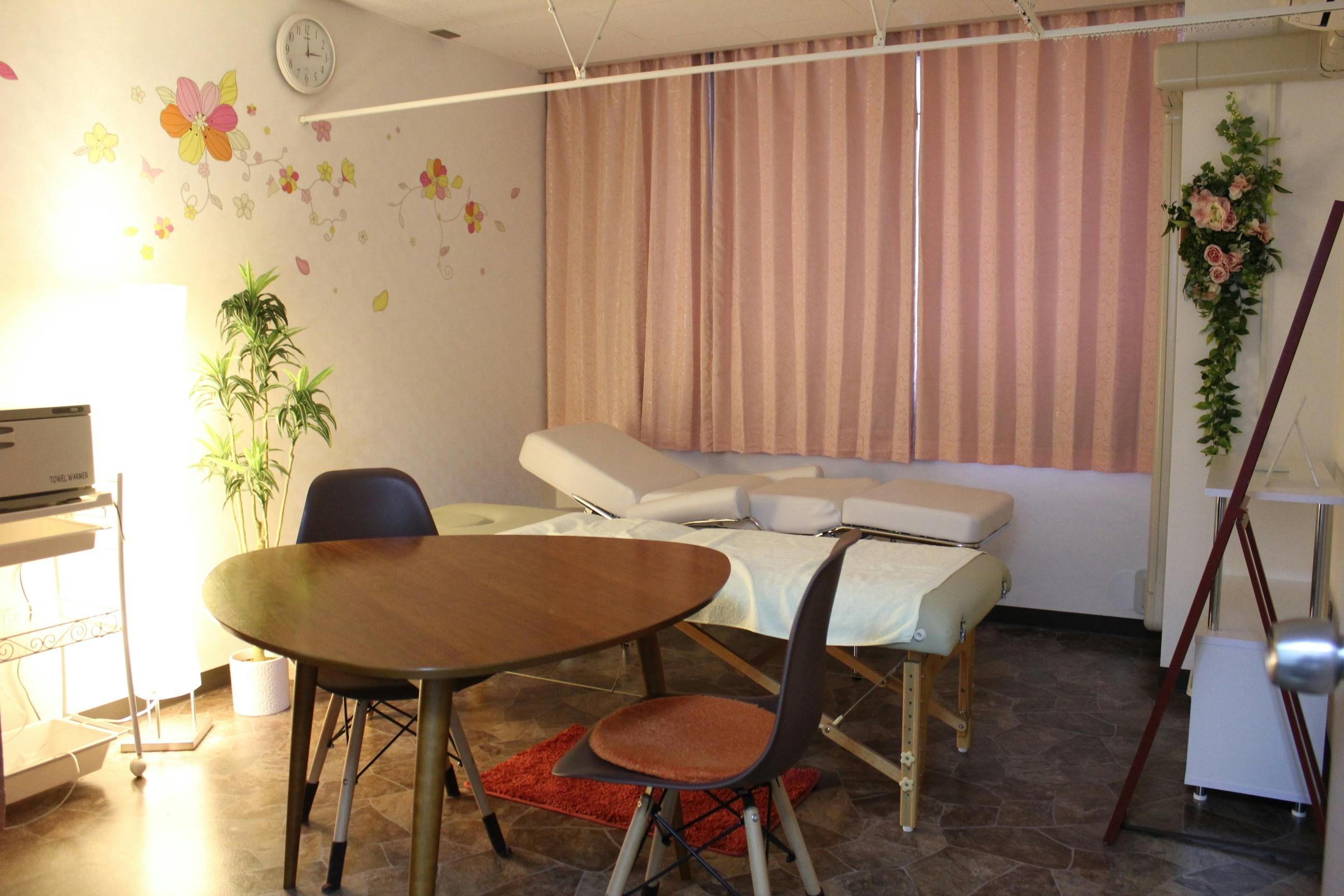 ソフトタイプ・整体タイプ各1台のベッドとテーブルがあり、カウンセリングも落ち着いてできます。