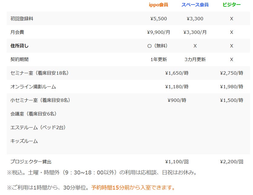 住所貸しを利用したいならippo会員に、住所貸しは不要ならスペース会員に!どちらも室料が40%オフになりますので、月に6時間以上ご利用くださる方は、会員になっていただいた方が断然お得です!