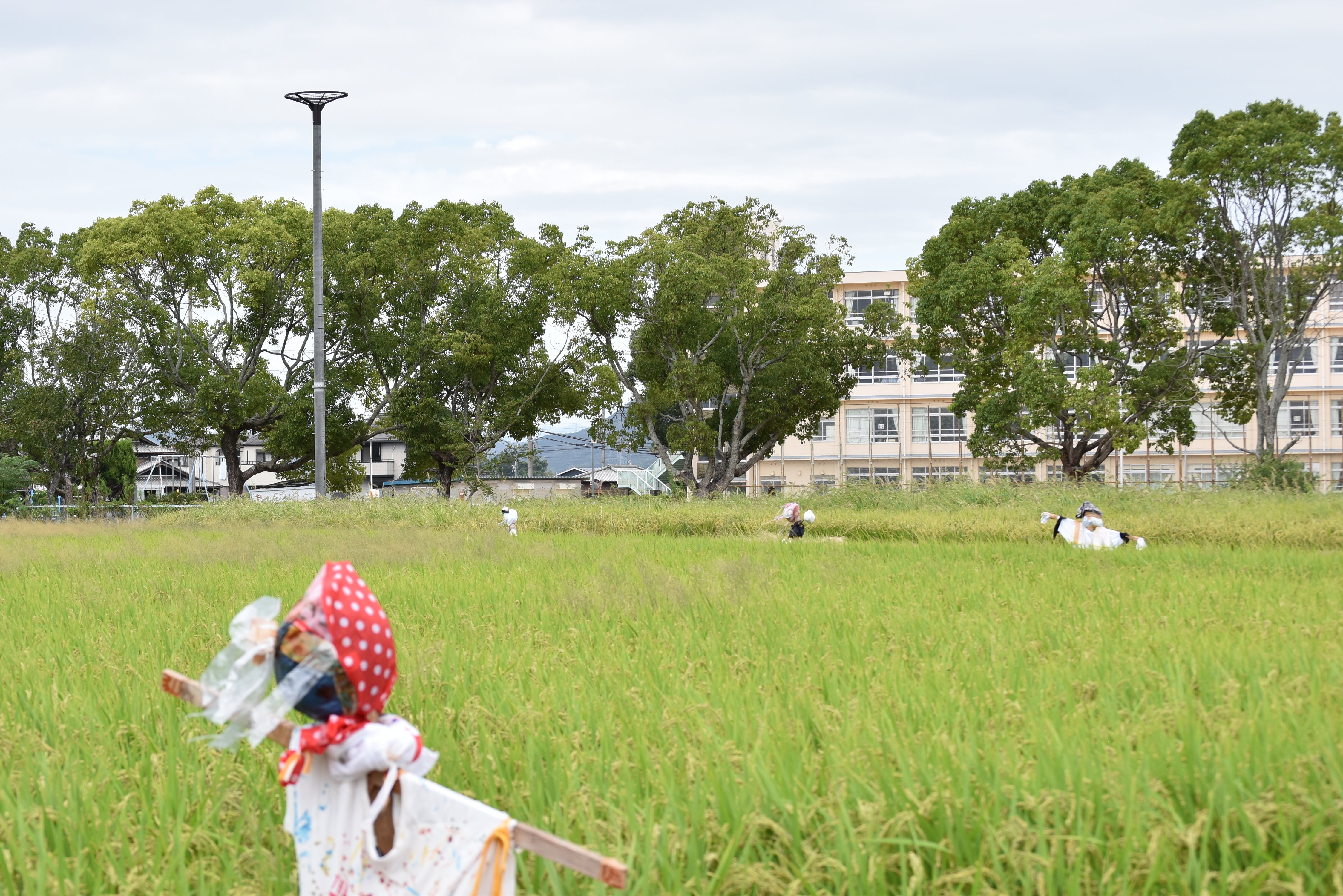 台風の影響もあり、工事が急遽前倒しになりました。前もって場所を確認。コーンがおかれ(写真一枚目)17日無事に巣塔が建ちました。柵は後日設置の予定です。写真を撮影しに向かったのですが、向かう最中、小学校の上空を優雅に飛ぶコウノトリの姿!飛翔中のコウノトリの撮影は間に合いませんでしたがもう一羽、近くの鉄塔の上に留まる姿がありました。今日は巣塔を見にやってきたのでしょうか、今年は例年より1ヶ月以上も早く飛来が見られました。小学校周辺でよく姿を見かけます。子供たちからも日々コウノトリ発見!の報告があります。今後が楽しみです。写真は、小学校の体験授業で行なっている稲作の田んぼ、昨日設置された手作りのカカシと巣塔です。このプロジェクト終了まであと2週間を切りました。実行委員会スタッフ一同、たくさんの企画で構成された10月1日の式典に向け、慌ただしく準備を進めています。皆様の一層のご支援、よろしくお願い申し上げます。