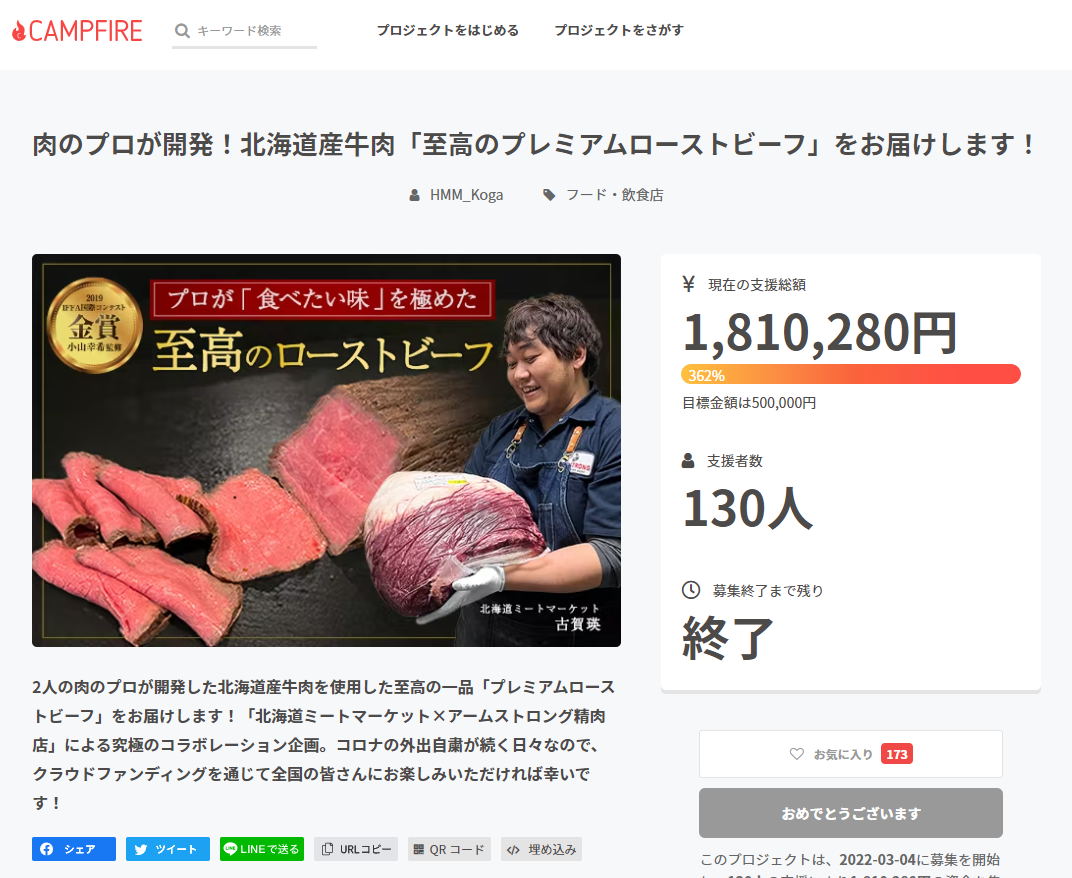 前プロジェクト「北海道ミートマーケット×アームストロング精肉店」ではみなさまからのあたたかいご支援で、なんと目標の362%を達成できました。本当にありがとうございます。