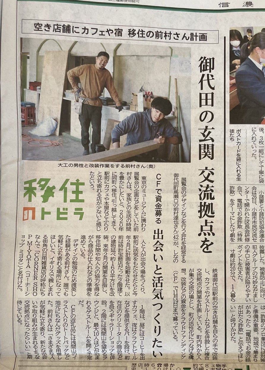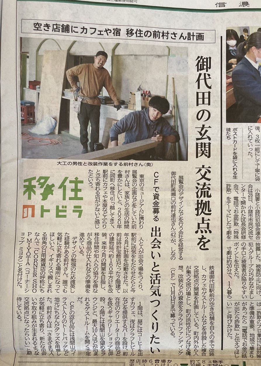 先日、信濃毎日新聞の移住のトビラ欄でCORNER SHOP MIYOTAを掲載いただきました。