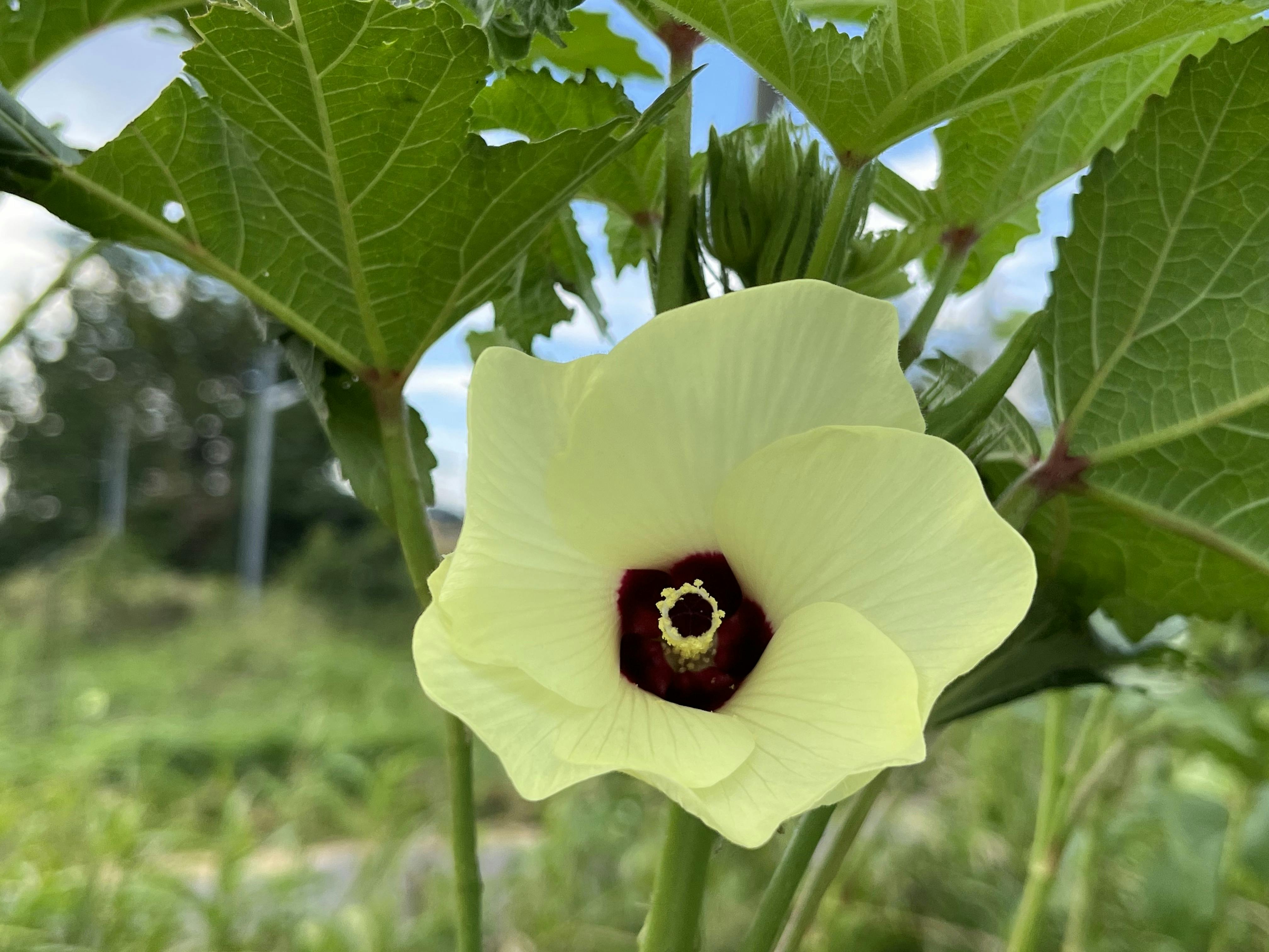台風11号が去って丸オクラは復活してきて花がたくさん咲いてます!綺麗です。ナスは傷がひどいため切り落としました。これからつける実に期待します!